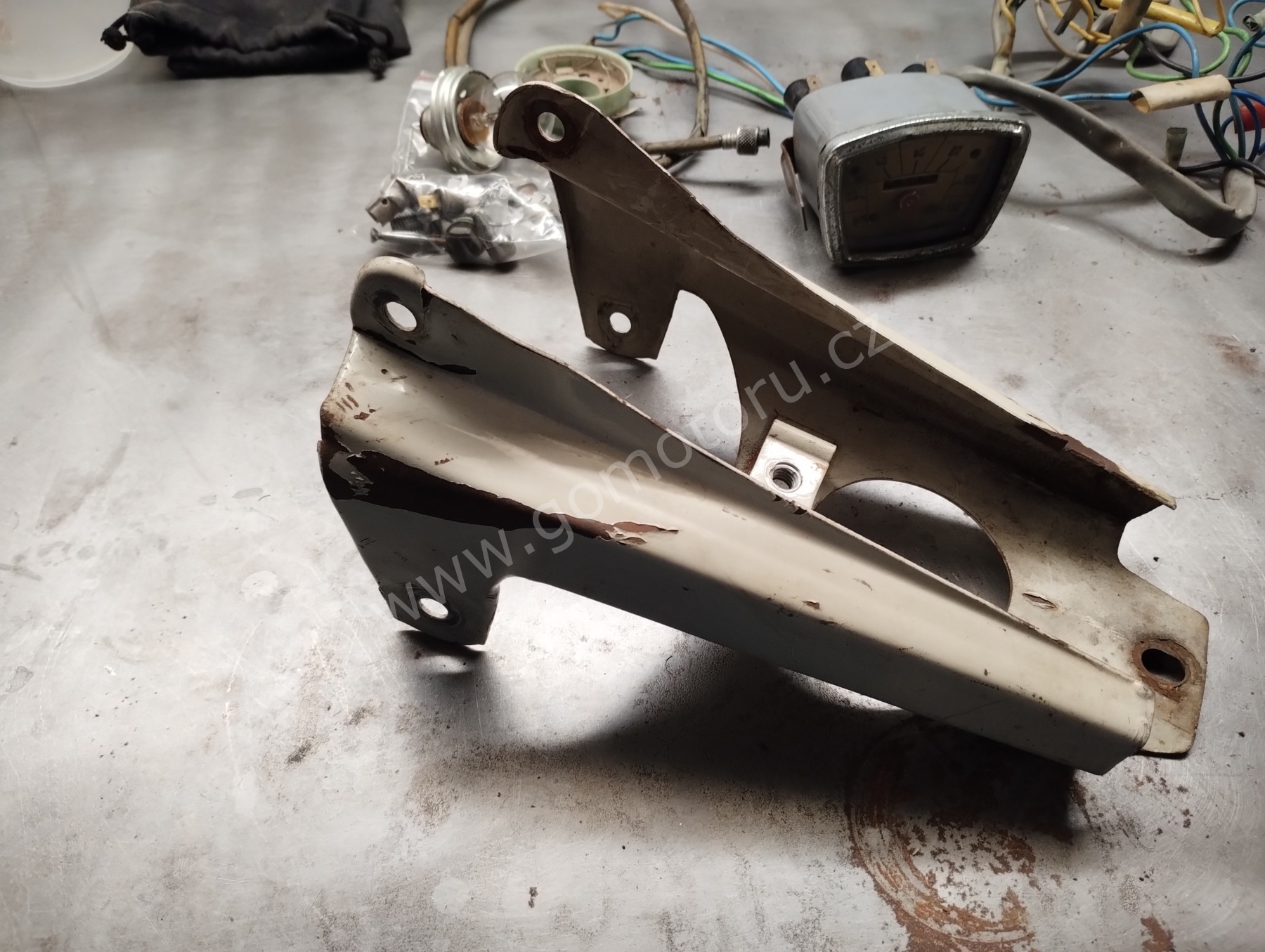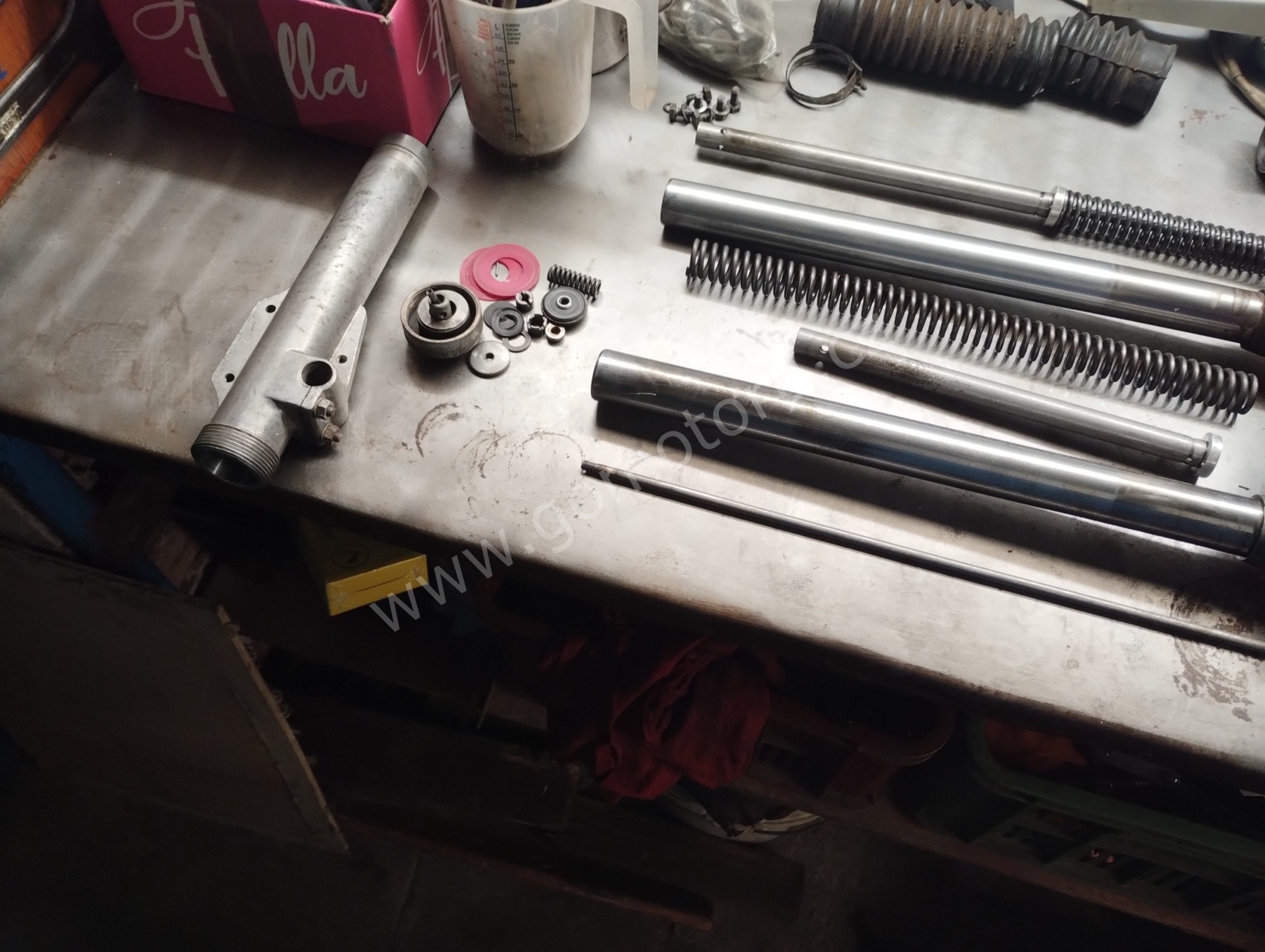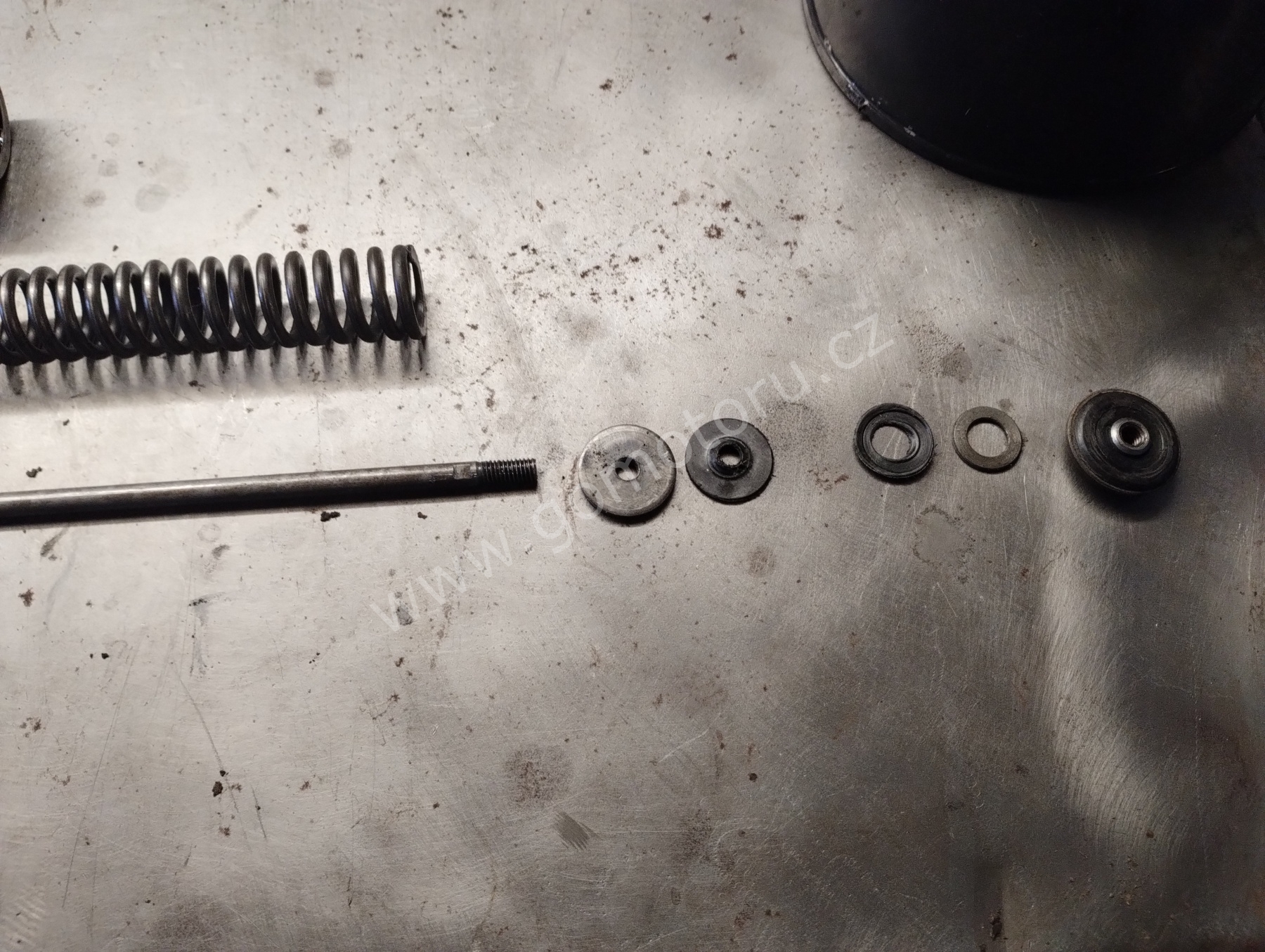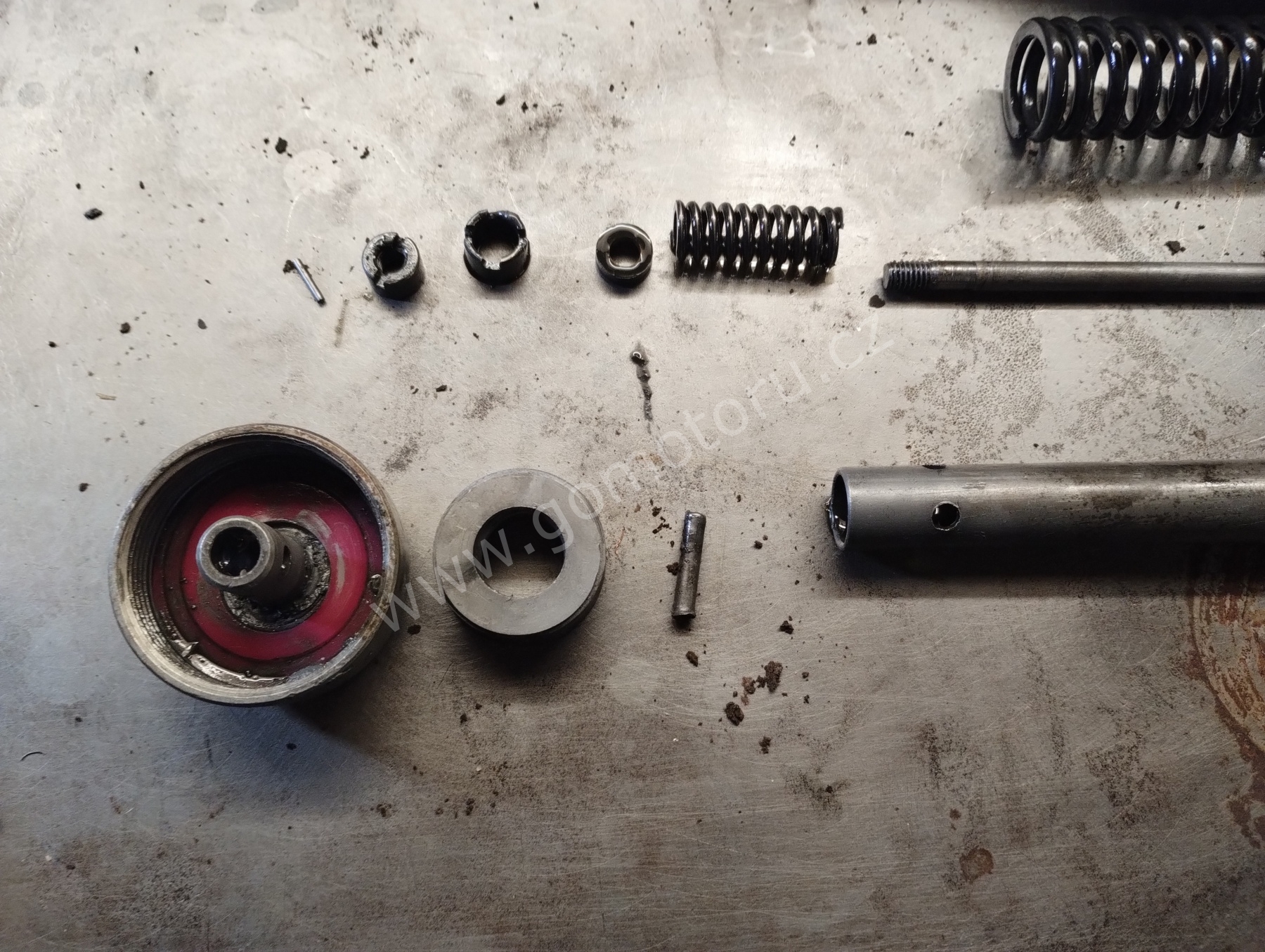 Rozebírám přední vidlici a jsem velice zvědavý co a v jakém stavu najdu uvnitř. Zajímavá sestava ale zároveň i nešťastné řešení. Nevím tedy proč vymýšleli nějakou novou vidlici. Když zadní tlumiče použili téměř totožné jako na kývačce. Nechápu tedy proč nepoužili alespoň stejnou koncepci i předních tlumičů jen s patřičnou úpravou kluzáků. Za mě jsou nešťastně řešené, ale s tím nic nenadělám. Malinko si je poupravím alespoň tak, aby byly bezpečné. Navíc jsem zjistil při hloubkovém bádání, že je moje přední vidlice z modelu Cross a že ji chybí plechové držáky, na které se navléká manžeta přední vidlice. Podařilo se mi je sehnat a tak tu mám první investici do motocyklu částkou 1200Kč.