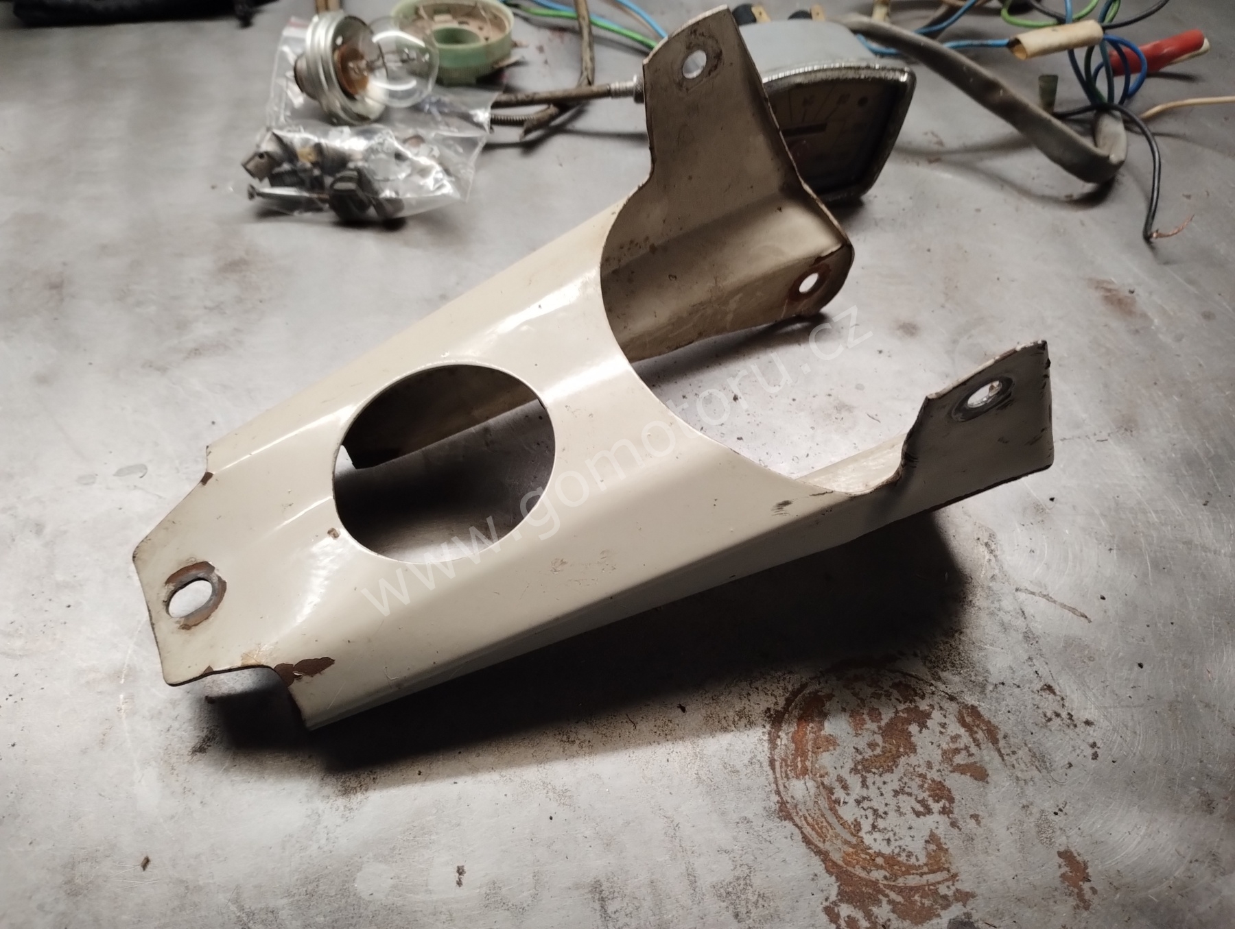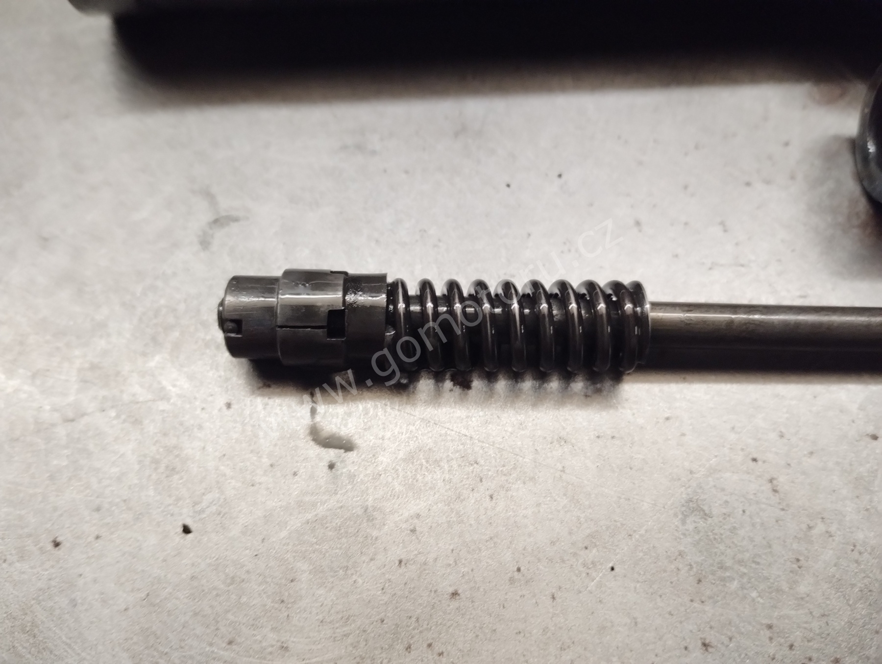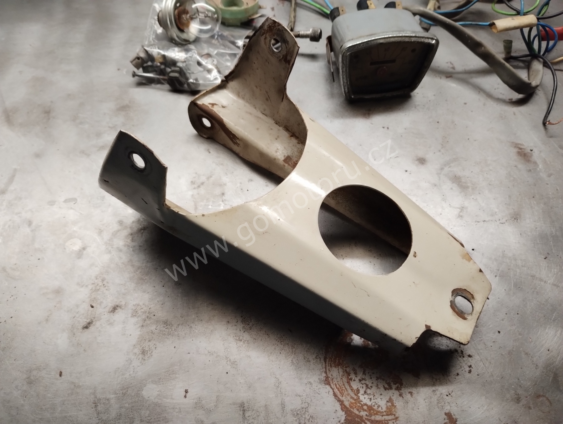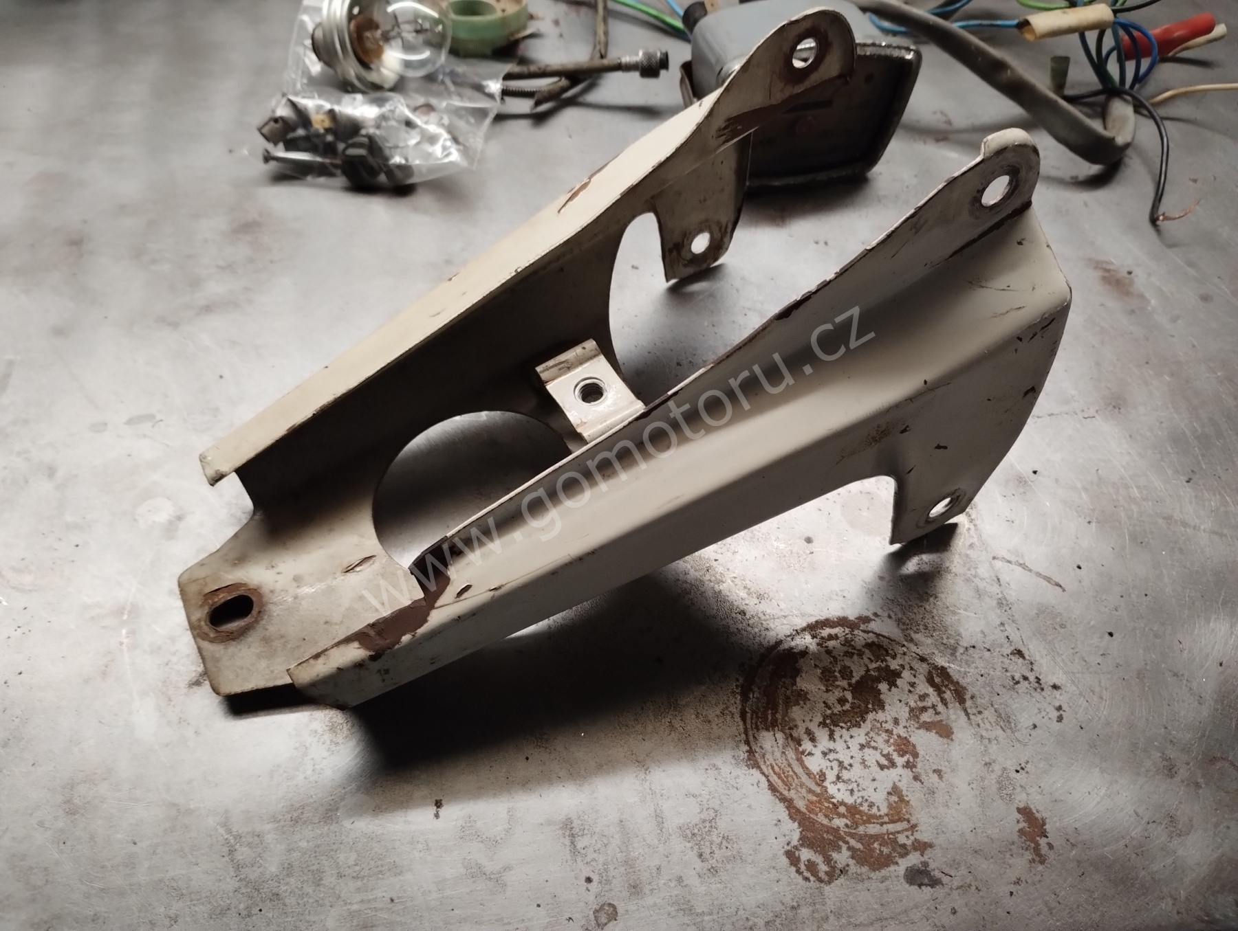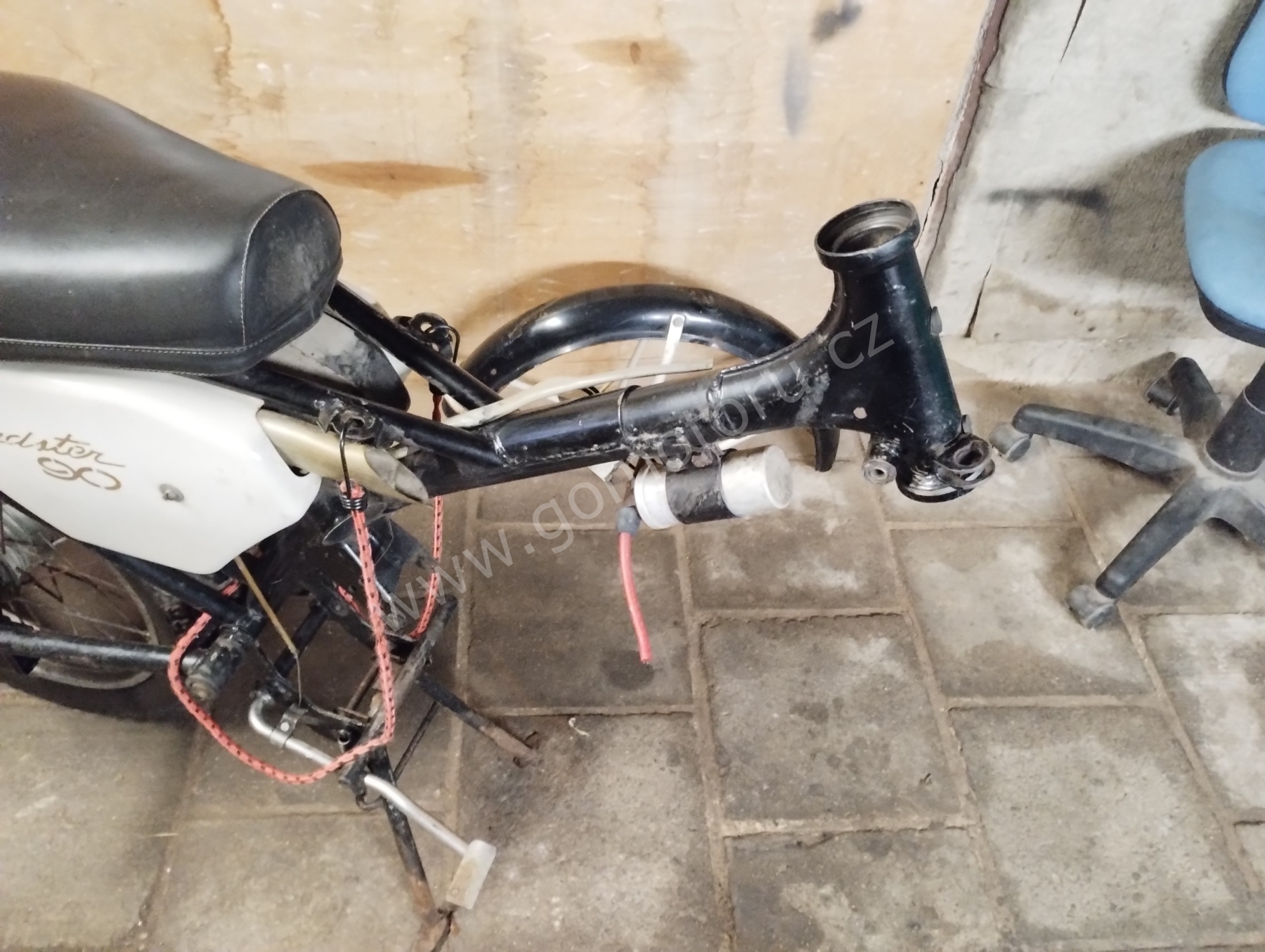 Rozebírám přední vidlici a jsem velice zvědavý co a v jakém stavu najdu uvnitř. Zajímavá sestava ale zároveň i nešťastné řešení. Nevím tedy proč vymýšleli nějakou novou vidlici. Když zadní tlumiče použili téměř totožné jako na kývačce. Nechápu tedy proč nepoužili alespoň stejnou koncepci i předních tlumičů jen s patřičnou úpravou kluzáků. Za mě jsou nešťastně řešené, ale s tím nic nenadělám. Malinko si je poupravím alespoň tak, aby byly bezpečné. Navíc jsem zjistil při hloubkovém bádání, že je moje přední vidlice z modelu Cross a že ji chybí plechové držáky, na které se navléká manžeta přední vidlice. Podařilo se mi je sehnat a tak tu mám první investici do motocyklu částkou 1200Kč.