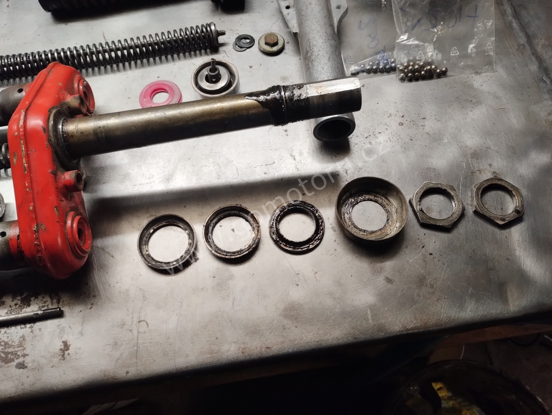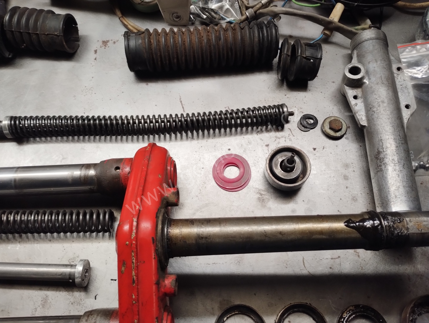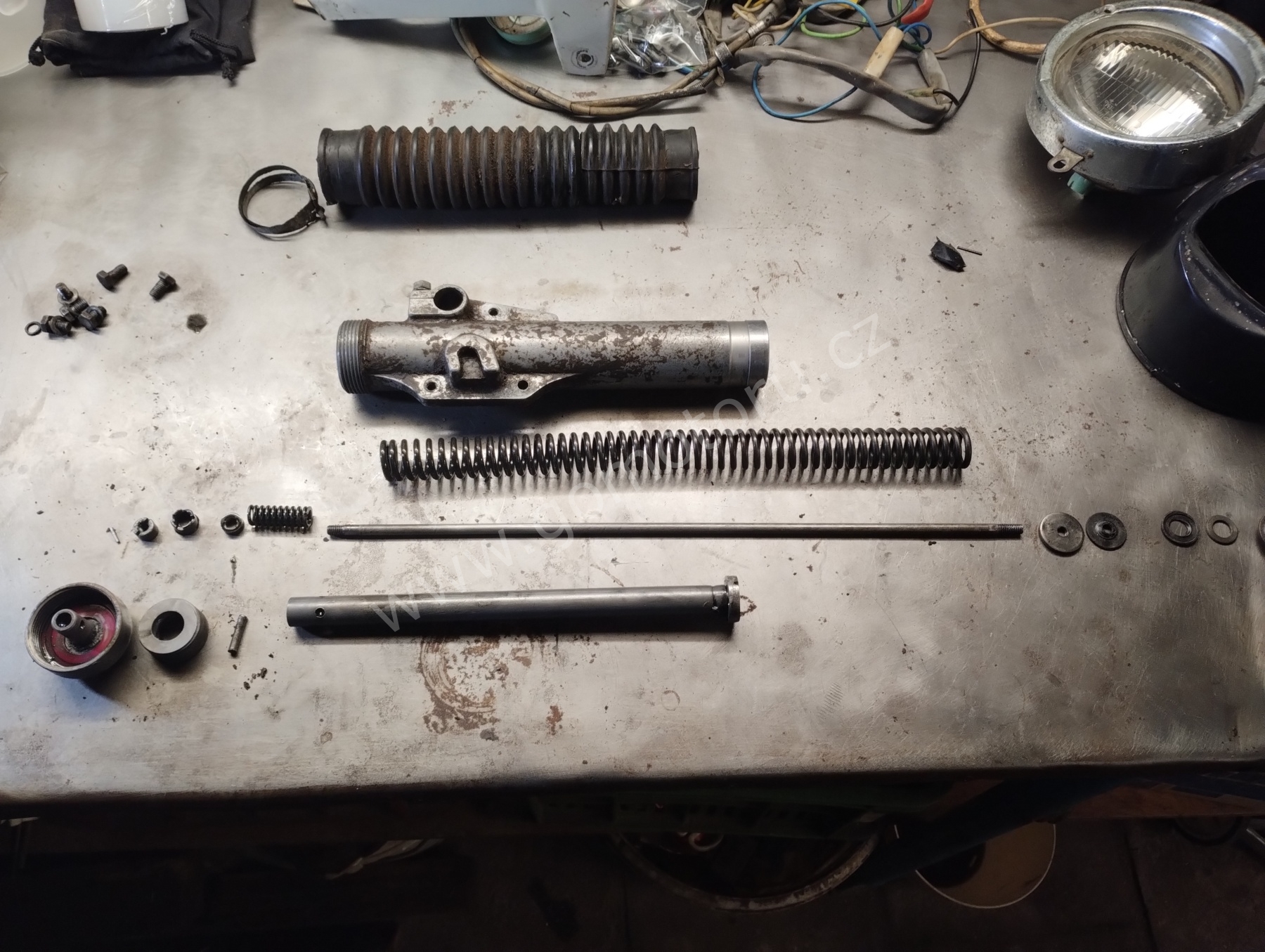 Rozebírám přední část motocyklu. Potřebuji odstrojit kompletní předek abych se podíval v jaké stavu je ložisko řízení. Vyčistím jej a připravím na vaření dorazu řízení. Nejdříve sundám držák předního světla se všemi komponenty. Rovnou si díly procházím, hodnotím a rozhoduji o jejich budoucím osudu. Nejvíce mě ale zajímá přední vidlice.