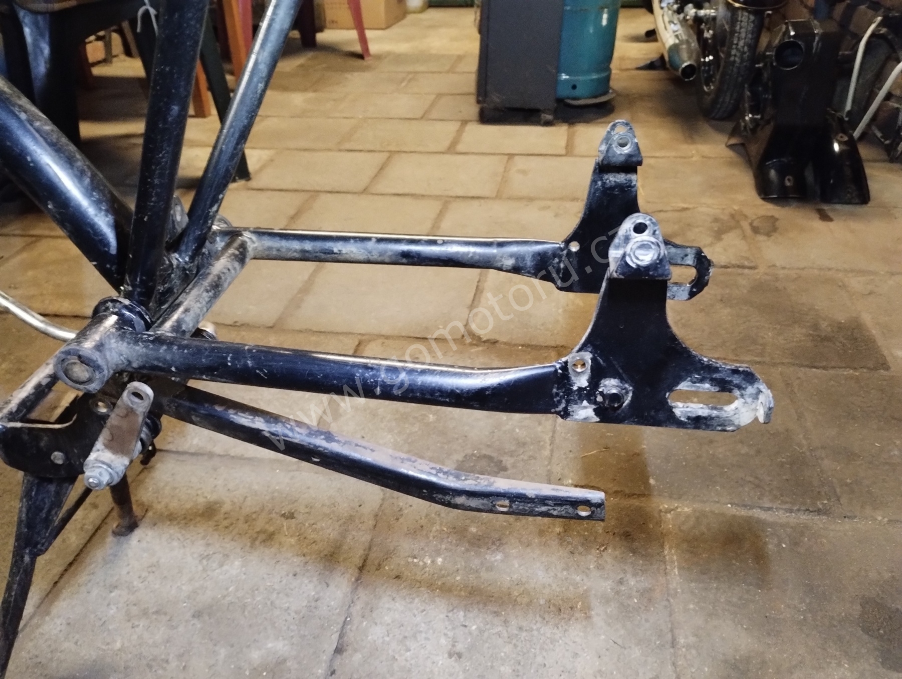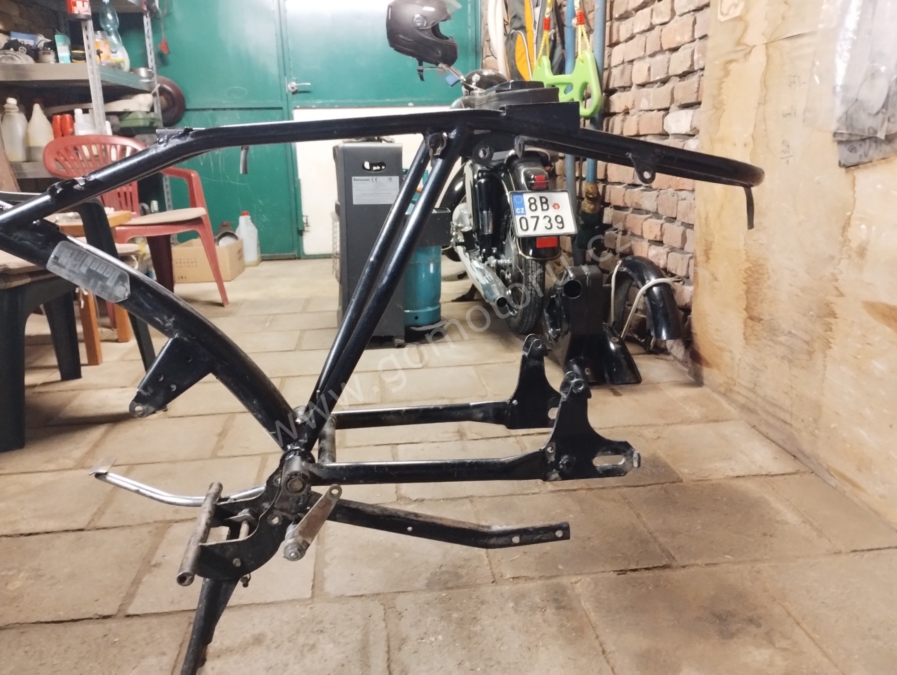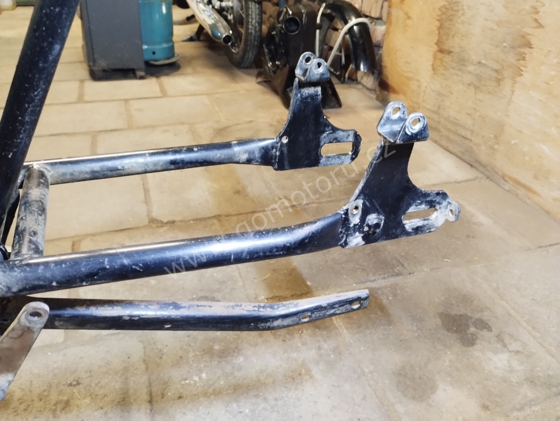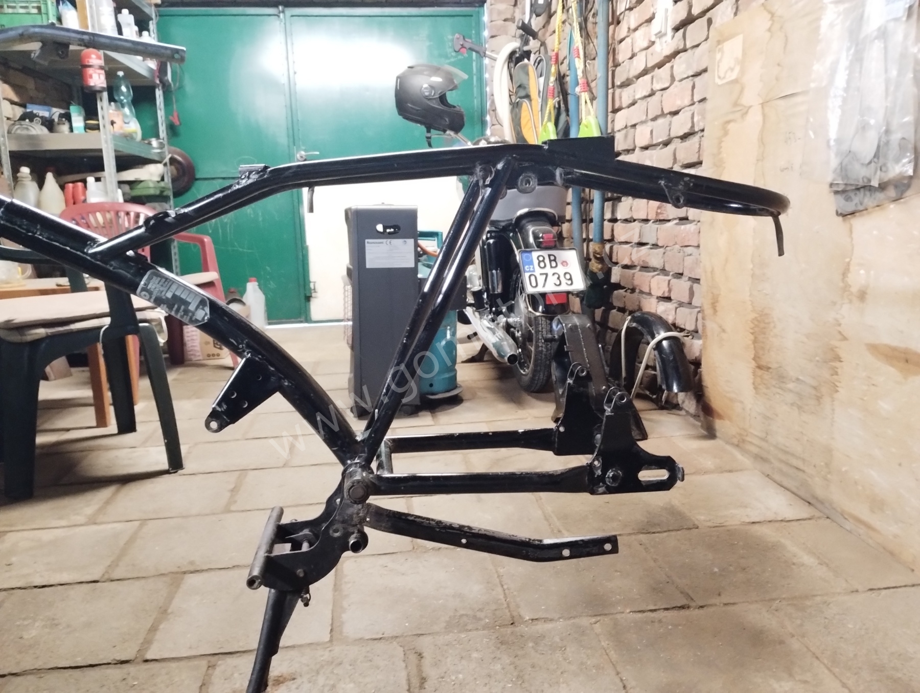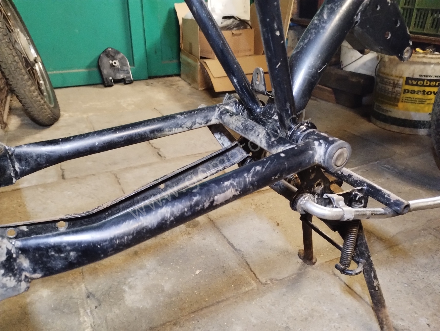 Motocykl mám kompletně rozebraný. Nechal jsem na rámu jen přední vidlici s kolem aby mohl rám bezpečně stát na stojanu. Dočistím špatně přístupná místa a aplikuji odrezovač. Jakmile rám oschne. Očistím jej, lehce přeleštím a nakonzervuji olejem.