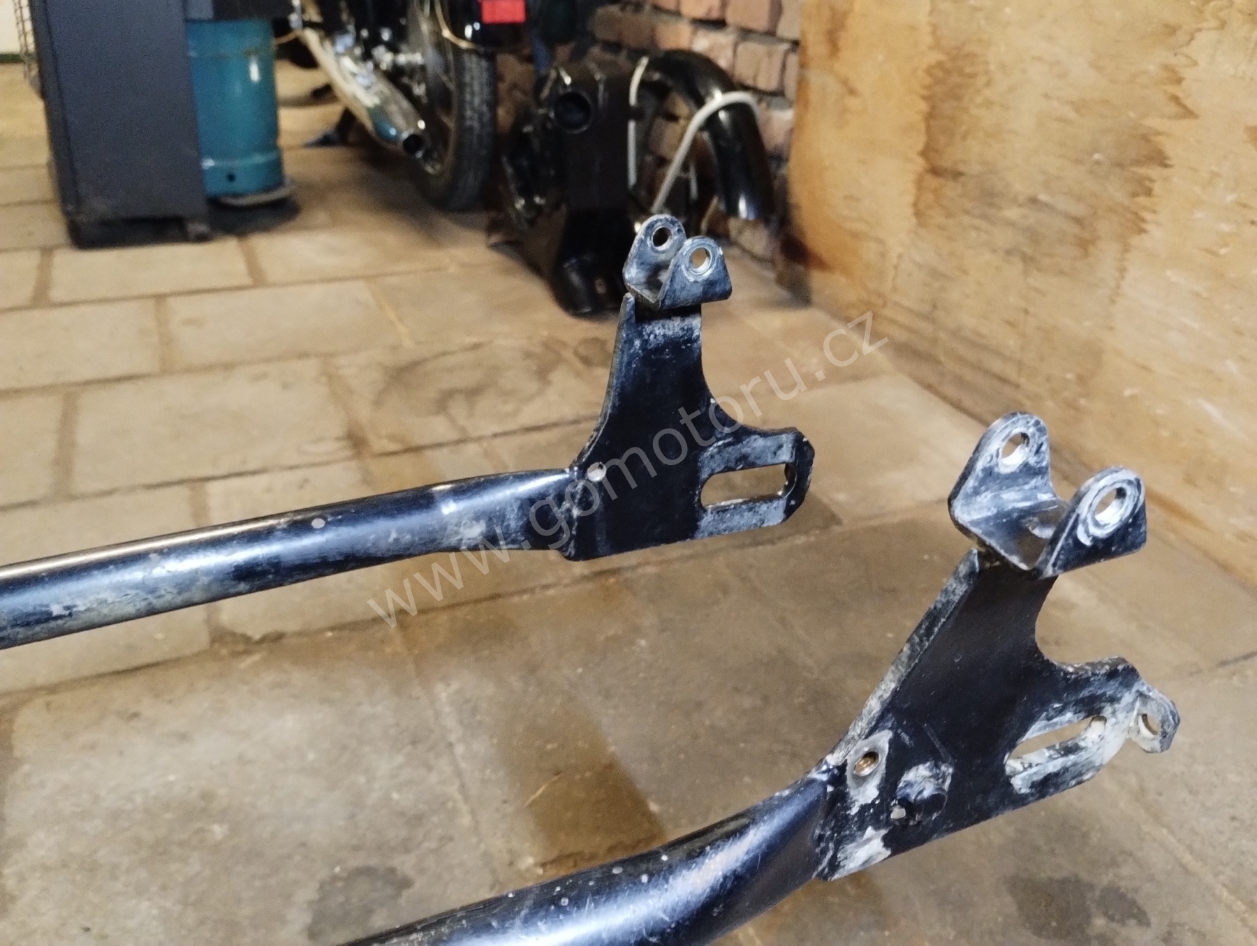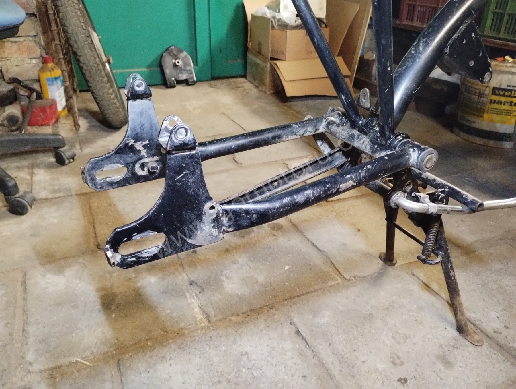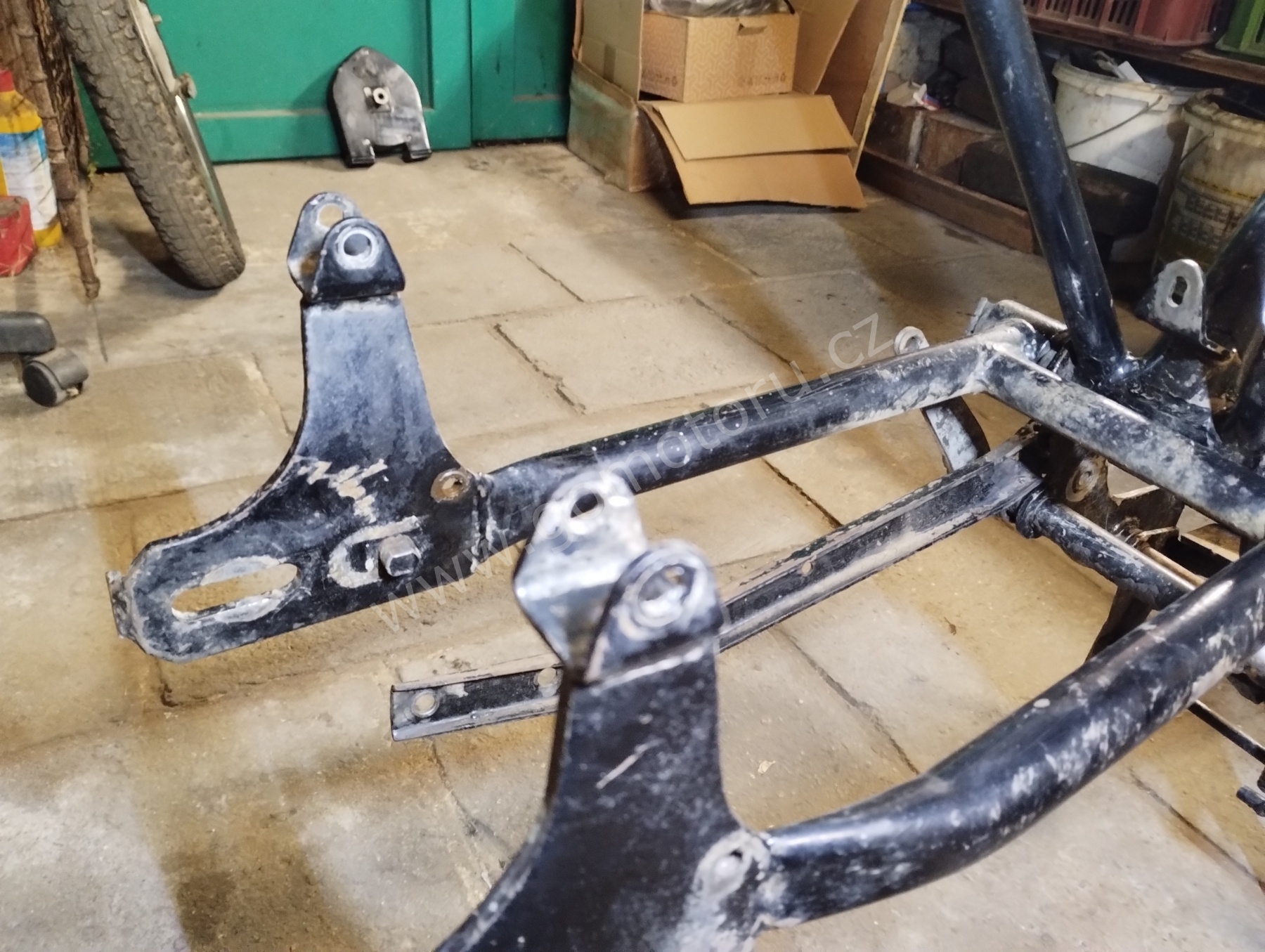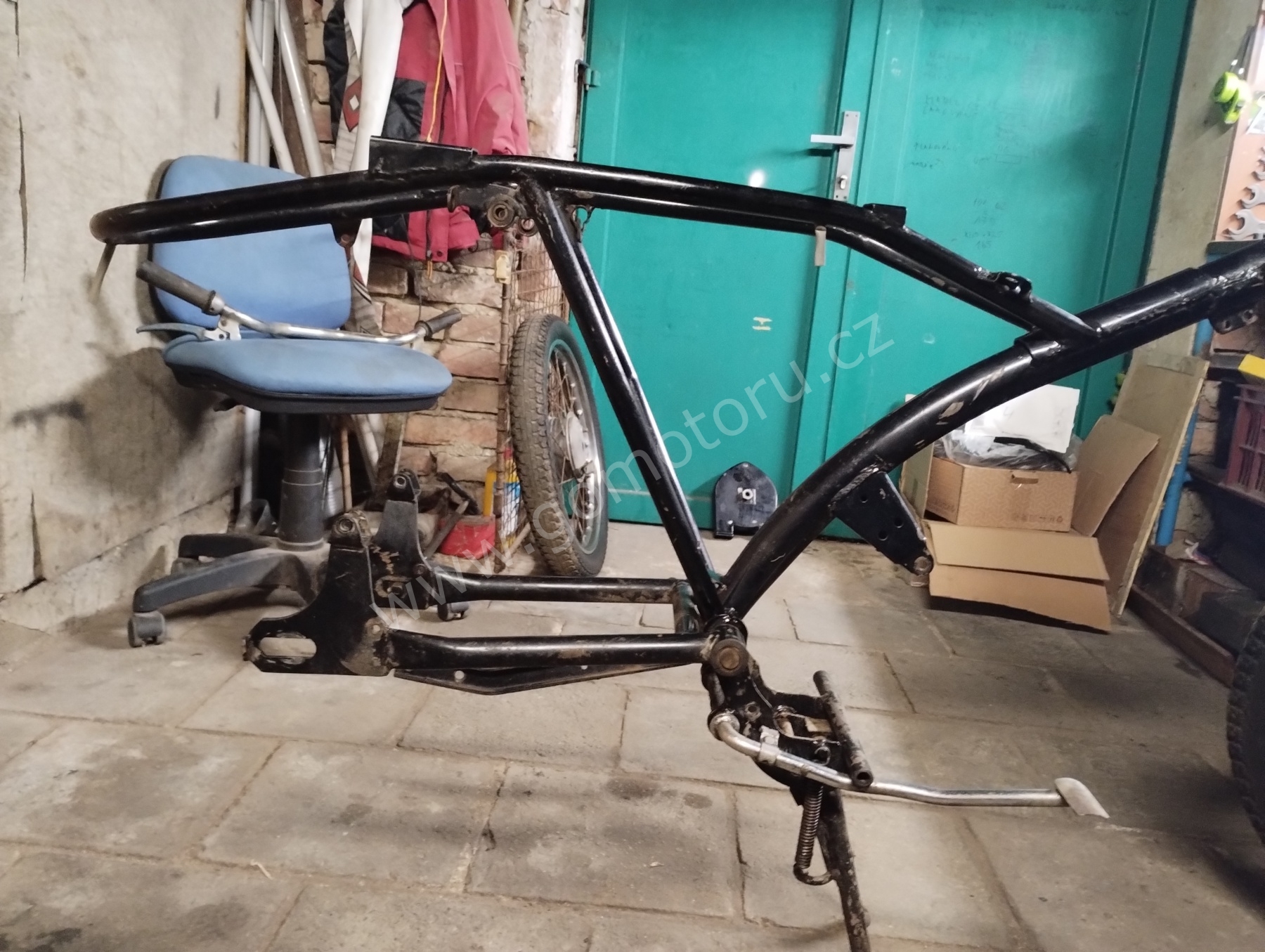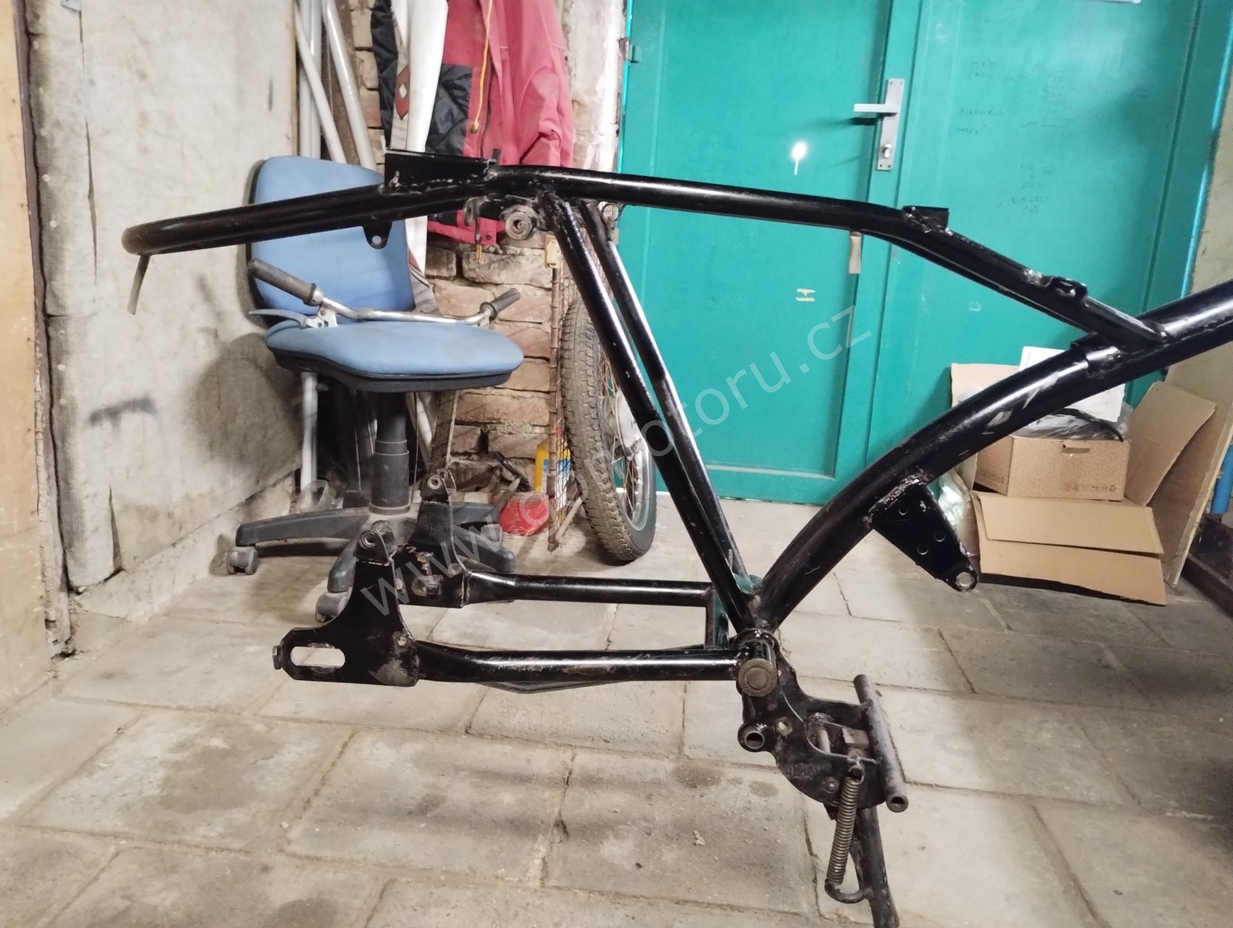 Motocykl mám kompletně rozebraný. Nechal jsem na rámu jen přední vidlici s kolem aby mohl rám bezpečně stát na stojanu. Dočistím špatně přístupná místa a aplikuji odrezovač. Jakmile rám oschne. Očistím jej, lehce přeleštím a nakonzervuji olejem.