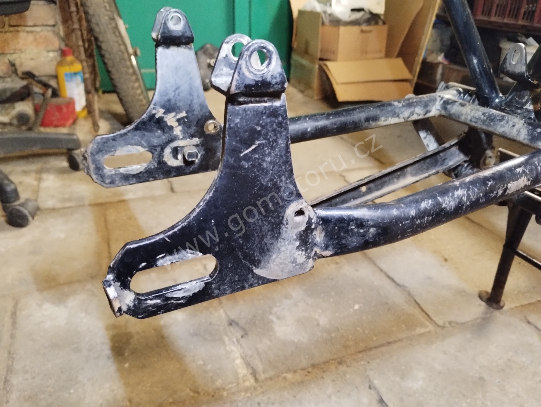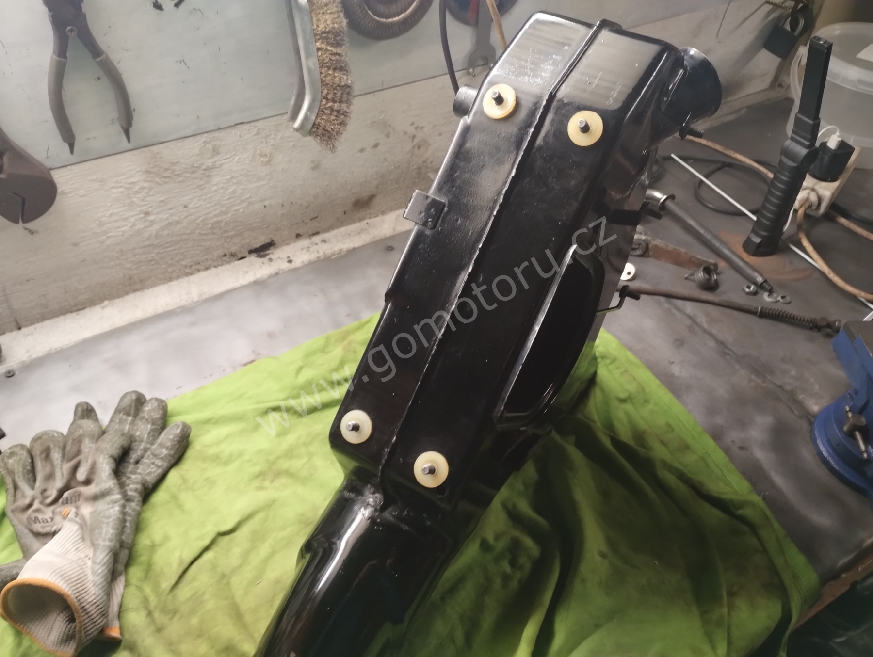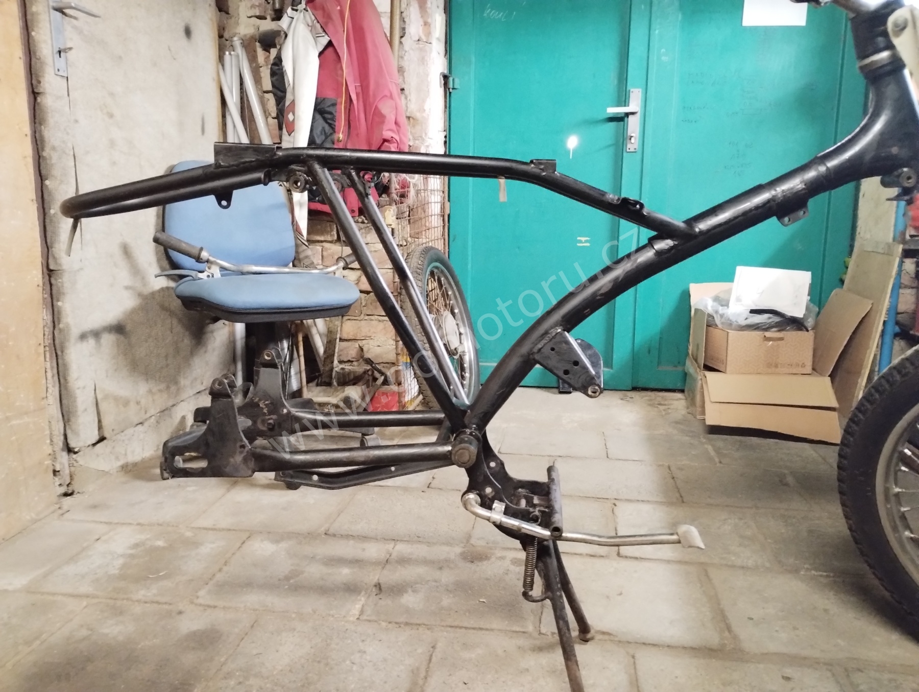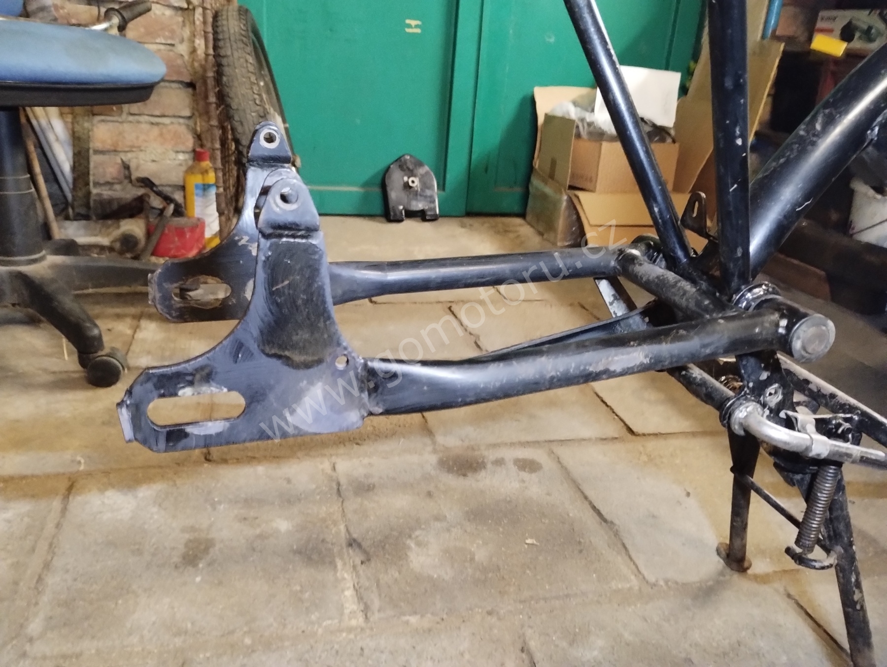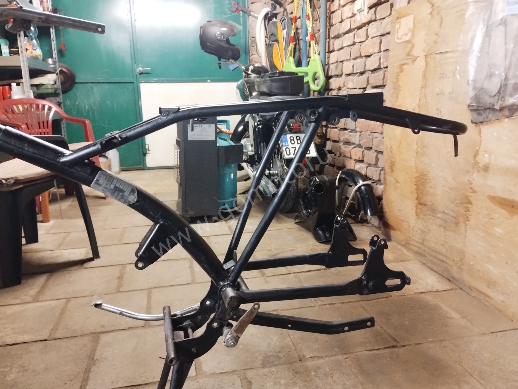 Motocykl mám kompletně rozebraný. Nechal jsem na rámu jen přední vidlici s kolem aby mohl rám bezpečně stát na stojanu. Dočistím špatně přístupná místa a aplikuji odrezovač. Jakmile rám oschne. Očistím jej, lehce přeleštím a nakonzervuji olejem.