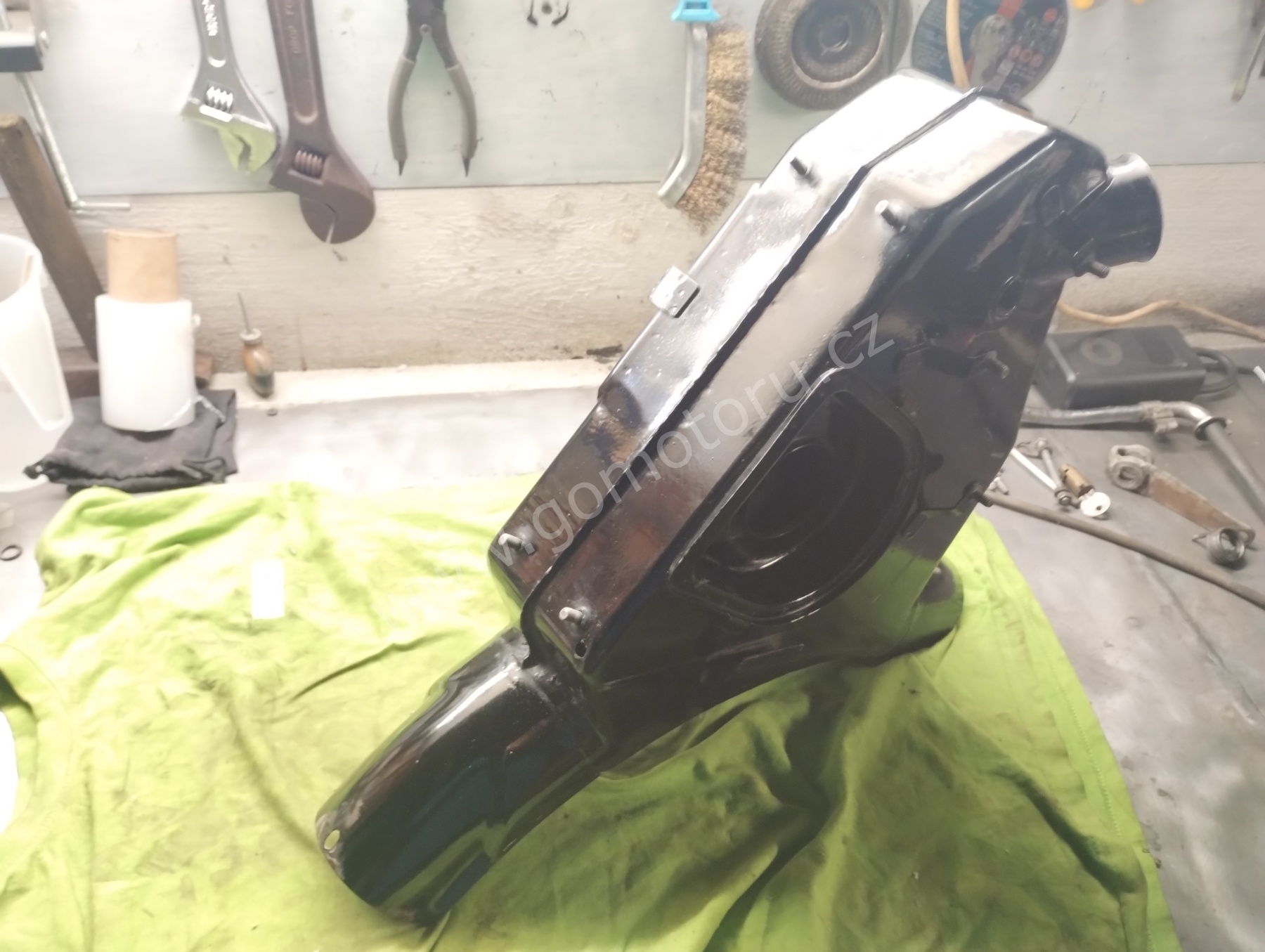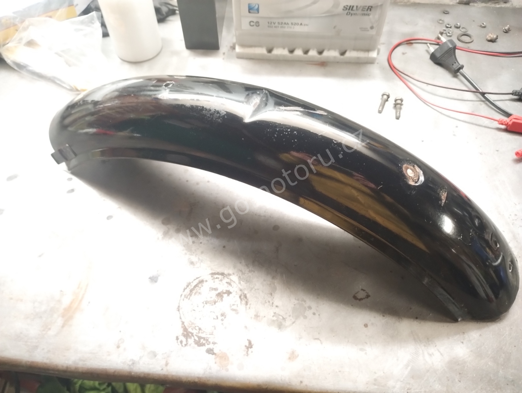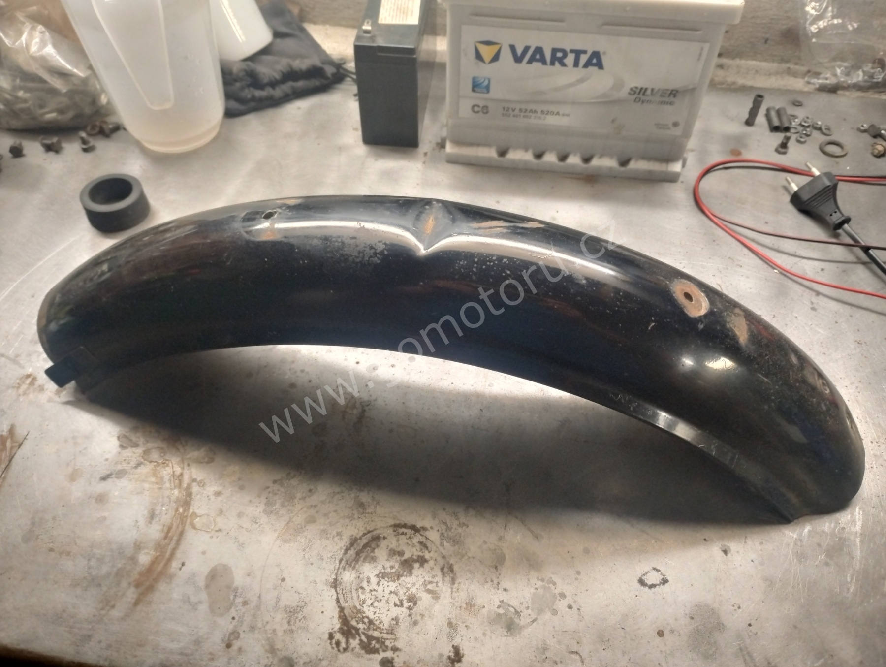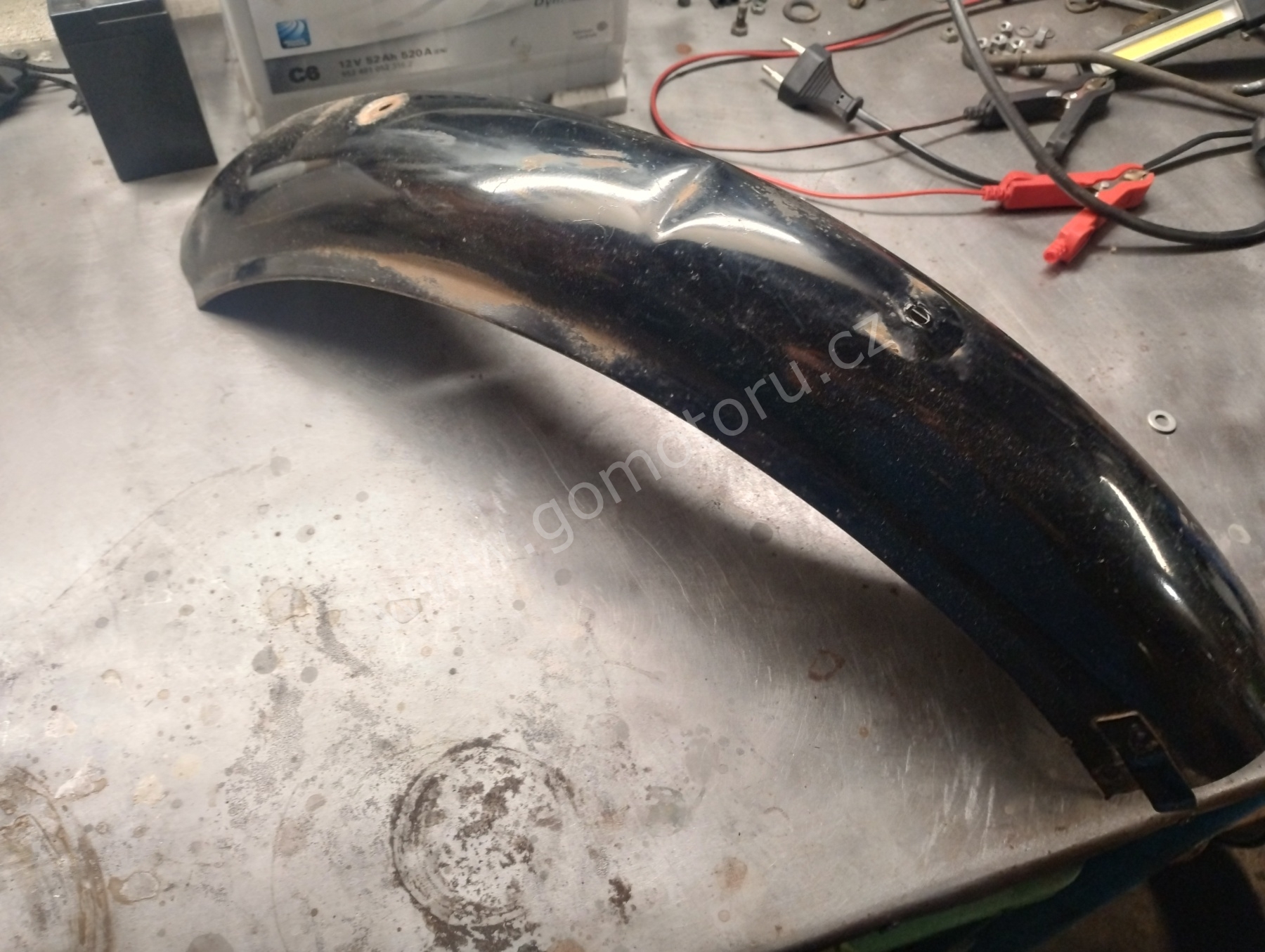 Zadní blatníček mám také vyčištěný a přeleštěný. Uvažuji, zda mám promáčklinu vyrovnat, ale rozhodl jsem se jí ponechat. Protože je promáčklina ukrytá pod trubkou rámu a na vizuální stránce motocyklu nic nemění, nechám ji tam.