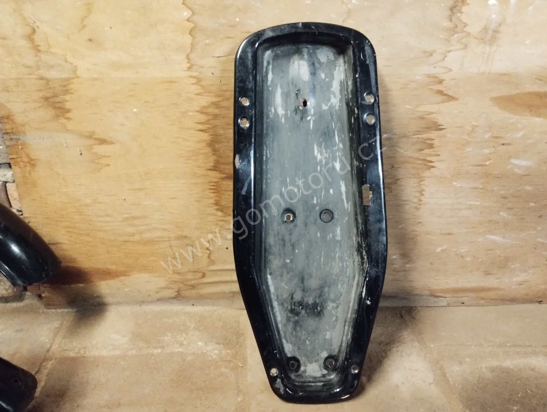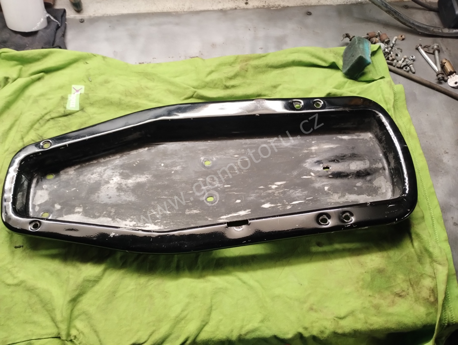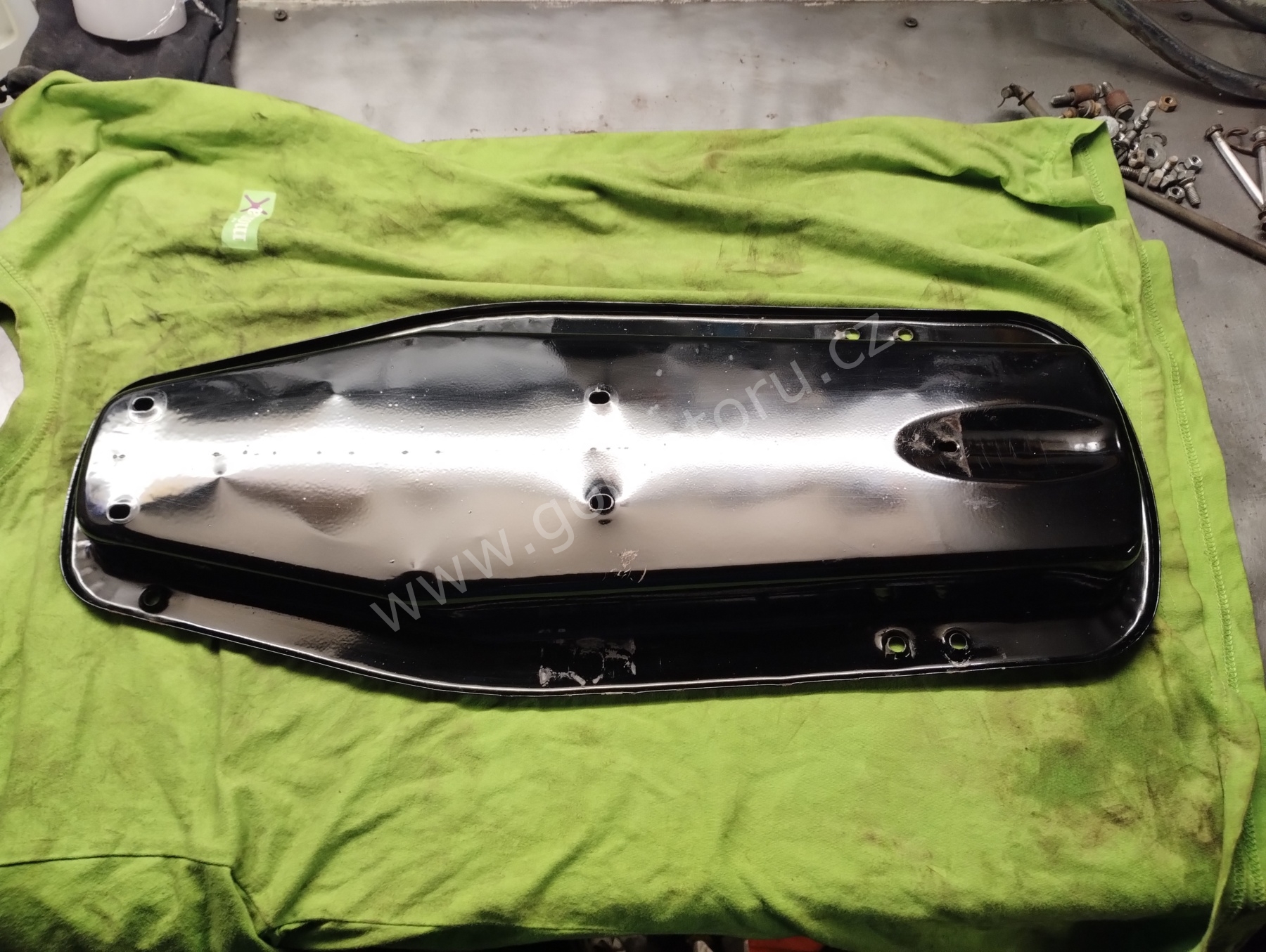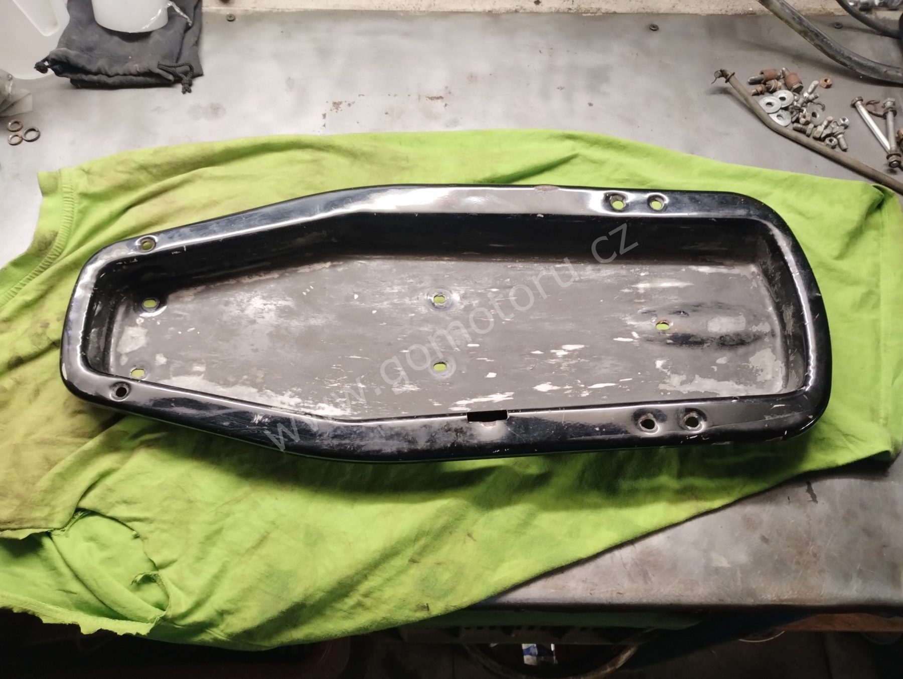 Zadní blatníček mám také vyčištěný a přeleštěný. Uvažuji, zda mám promáčklinu vyrovnat, ale rozhodl jsem se jí ponechat. Protože je promáčklina ukrytá pod trubkou rámu a na vizuální stránce motocyklu nic nemění, nechám ji tam.