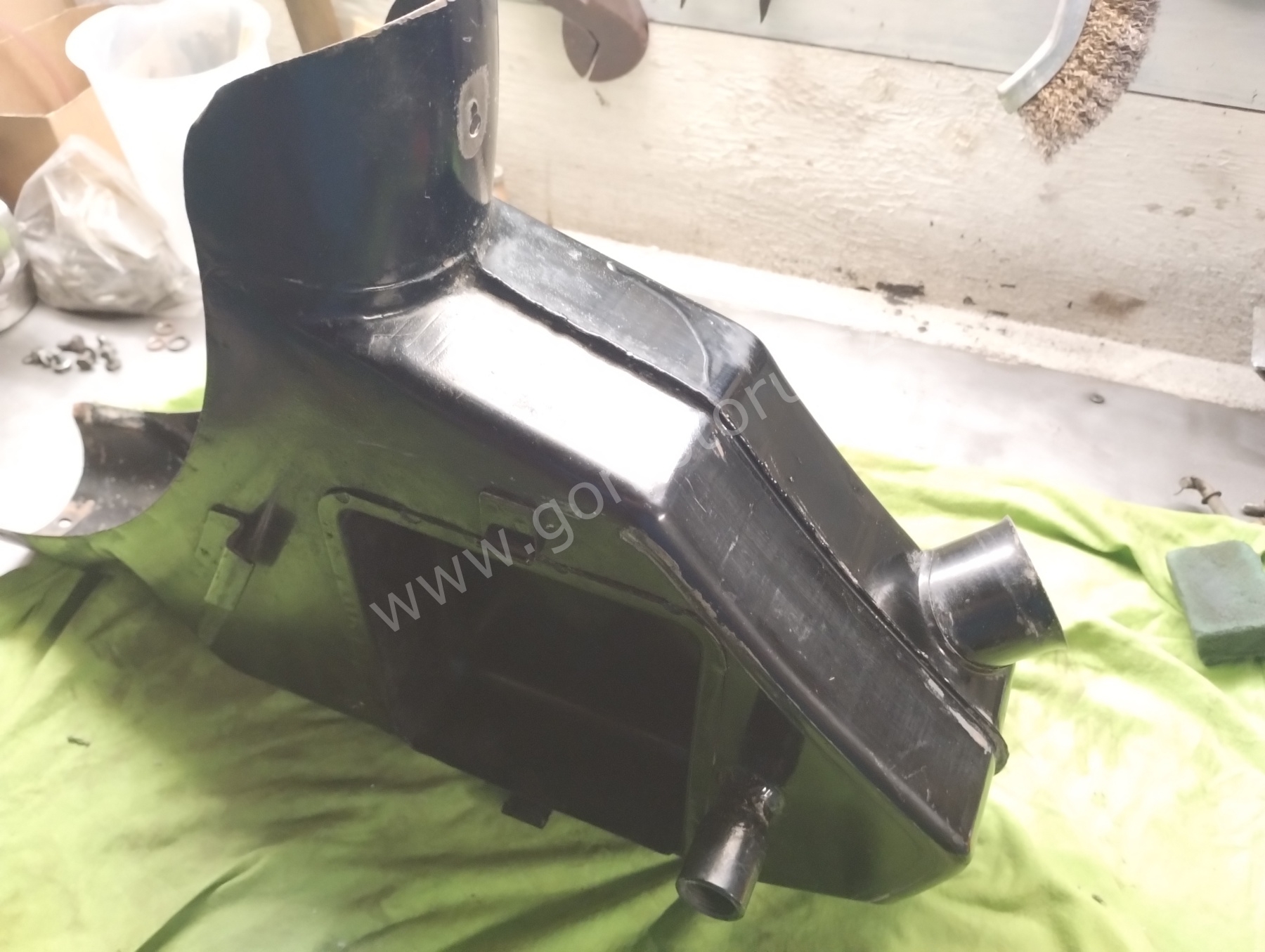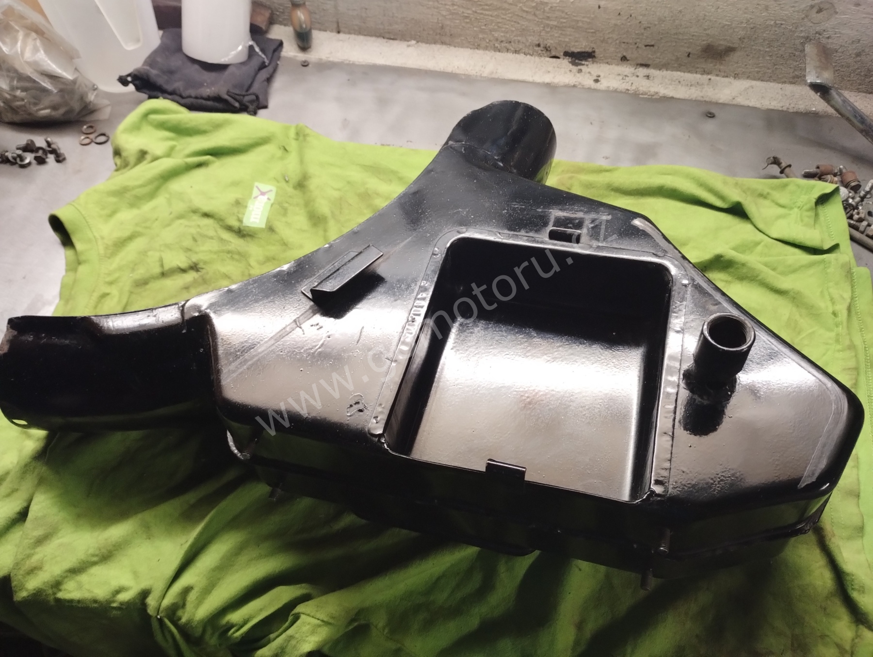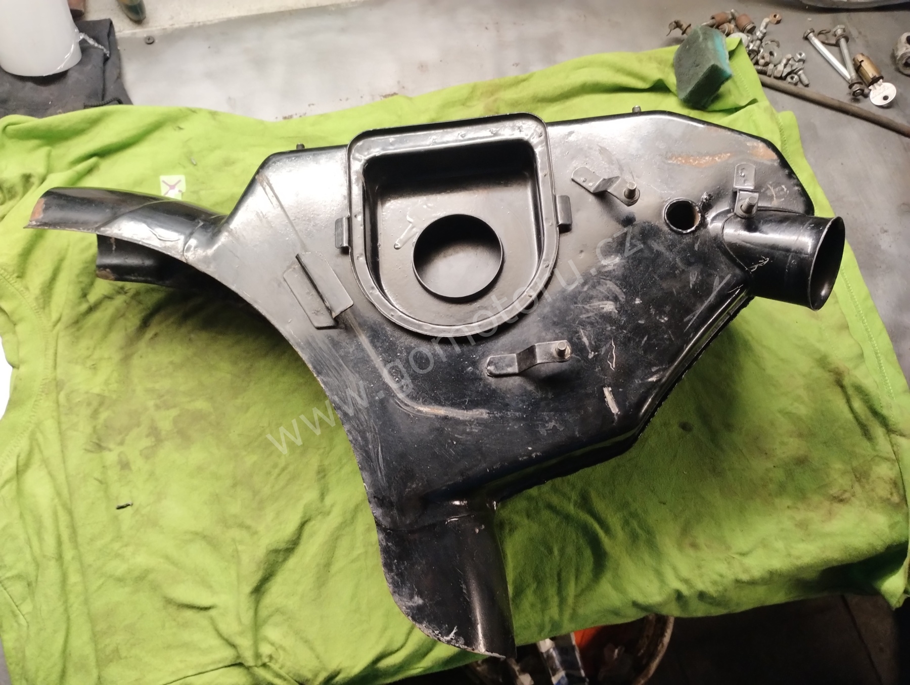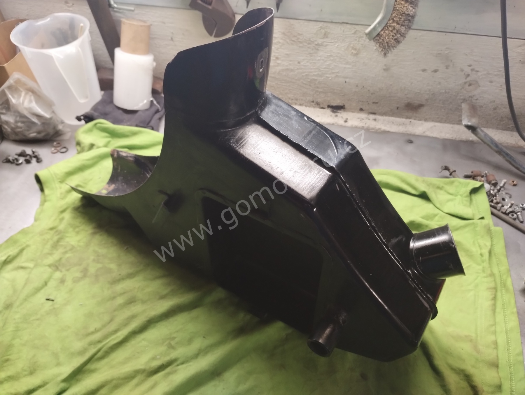 Zadní blatníček mám také vyčištěný a přeleštěný. Uvažuji, zda mám promáčklinu vyrovnat, ale rozhodl jsem se jí ponechat. Protože je promáčklina ukrytá pod trubkou rámu a na vizuální stránce motocyklu nic nemění, nechám ji tam.