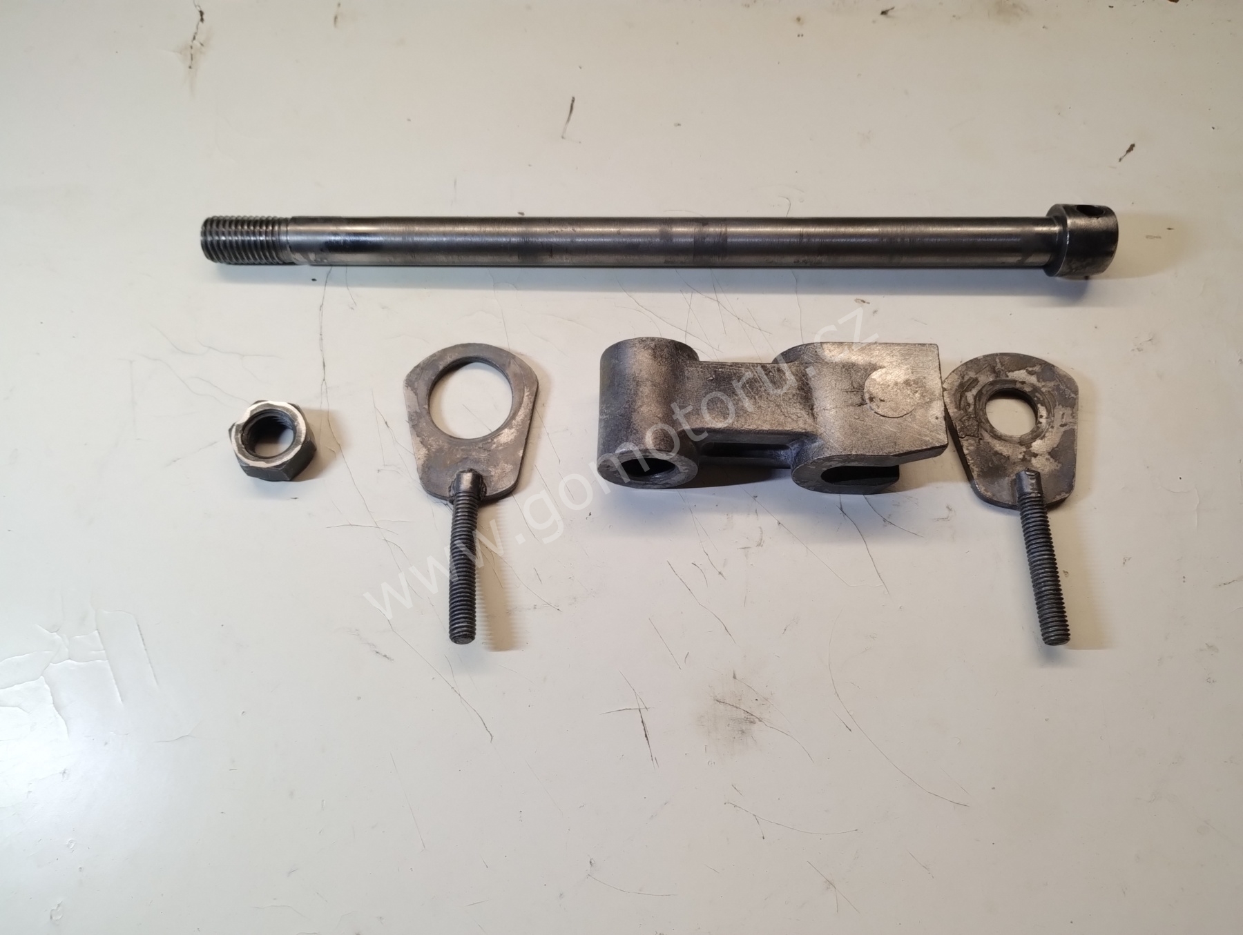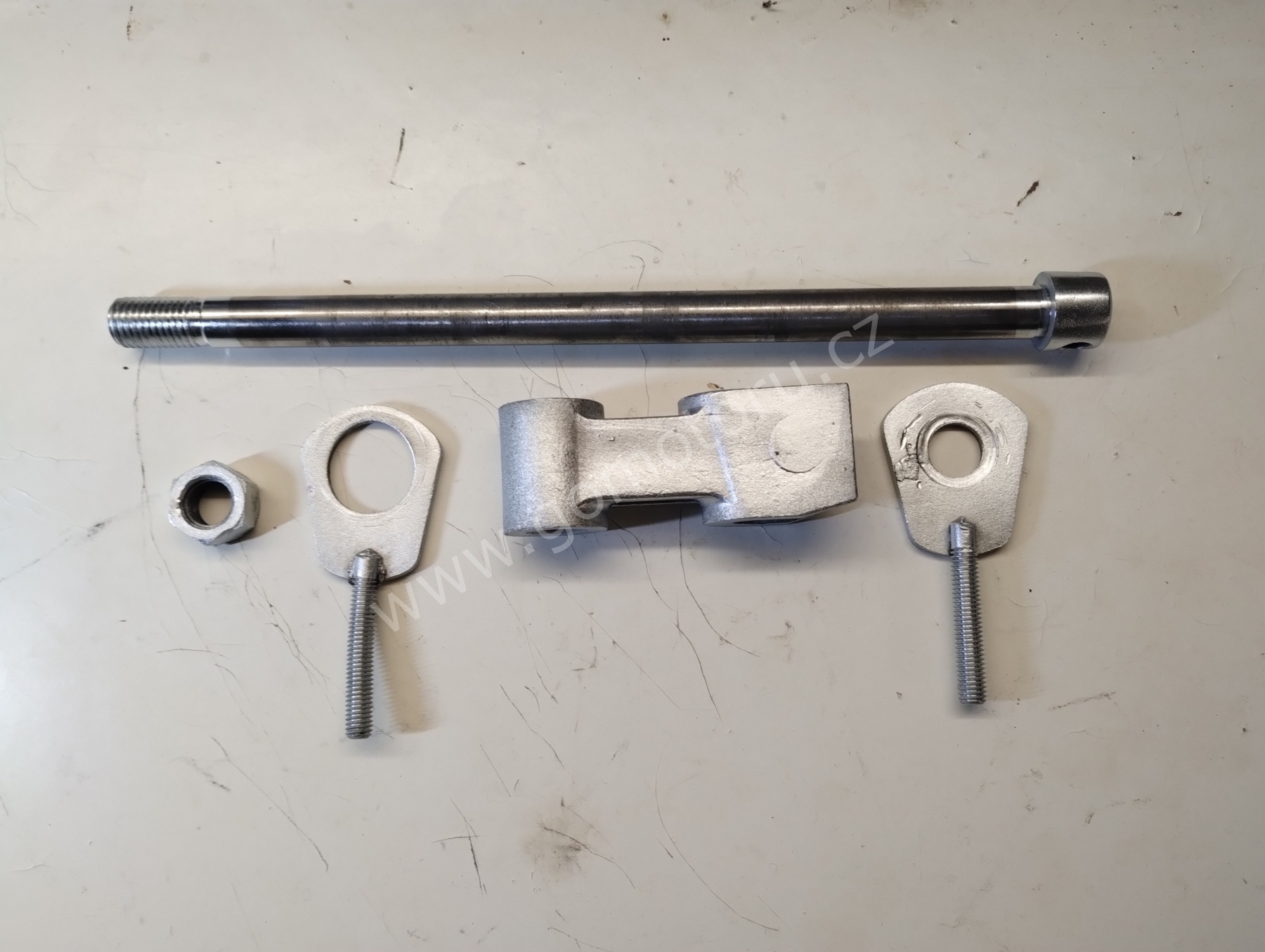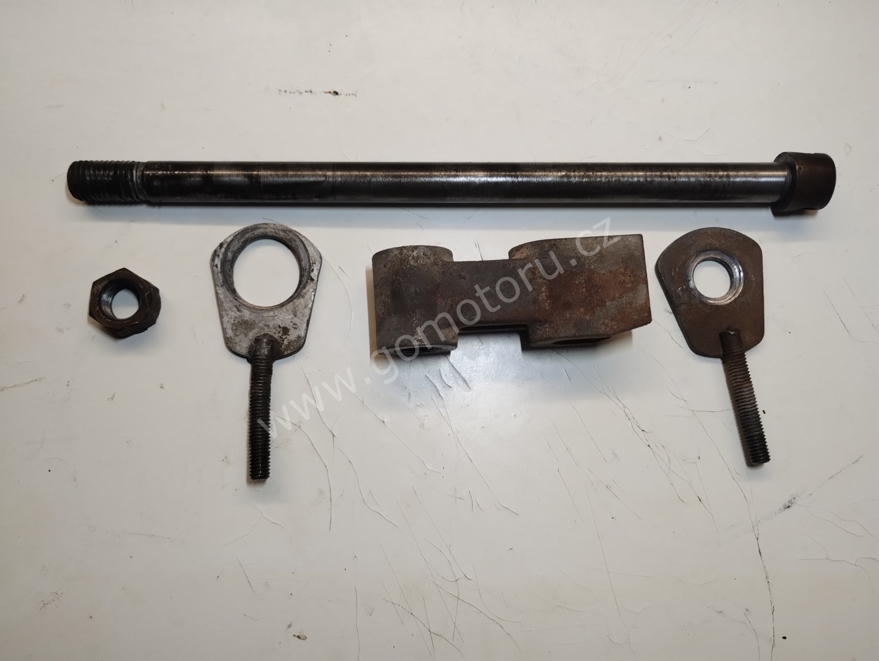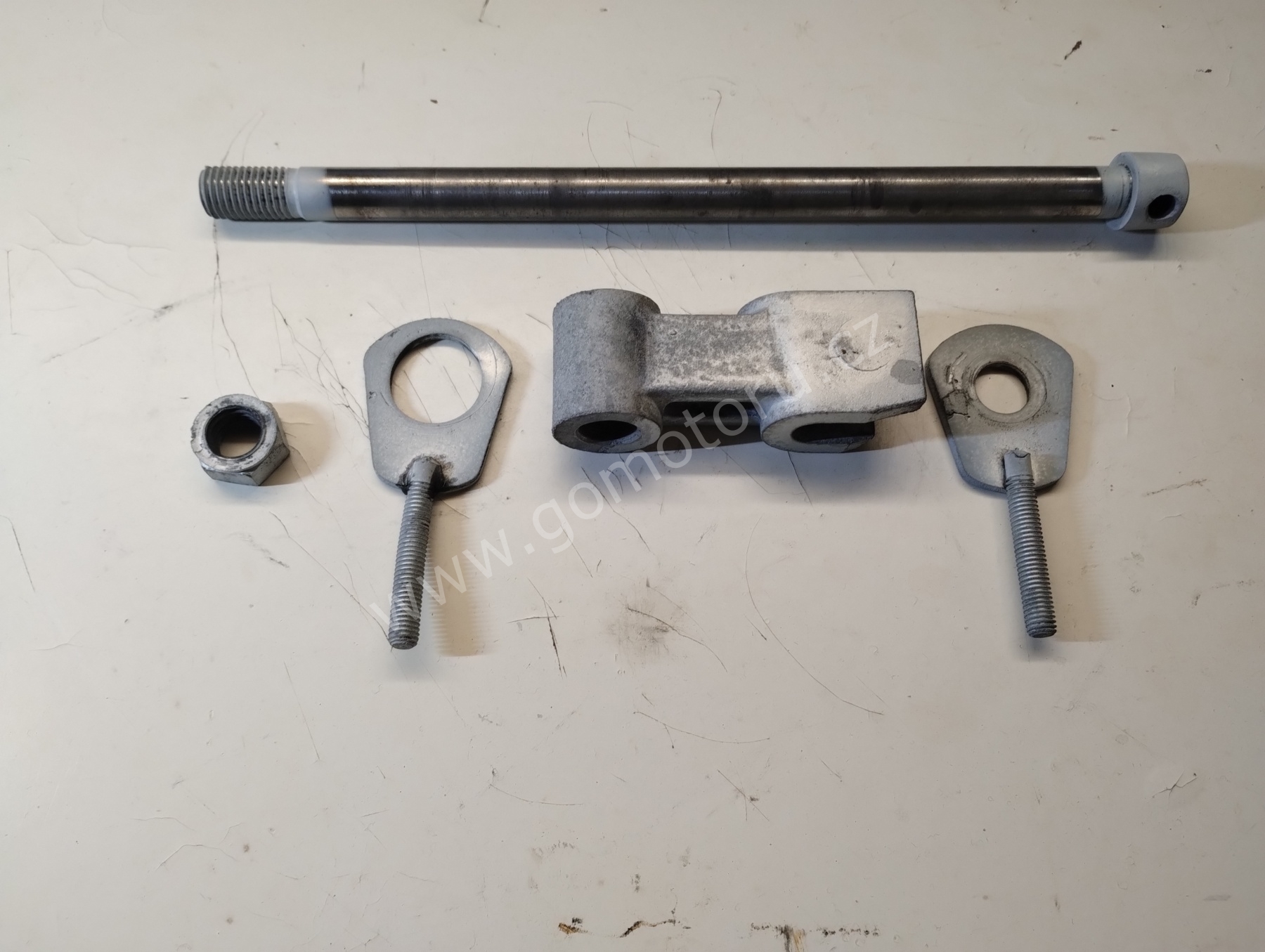 V první etapě pozinkuji díly pro uchycení zadního kola. Osa, matice, záchyt brzdy a šponováky. Nejdříve je potřeba všechny díly okartáčovat od špíny a rzi. První fotografie ukazuje původní stav. Druhá fotografie po očištění. Třetí fotografie je po zinkování a poslední foto z galerie jsou hotové díly po dočištění.