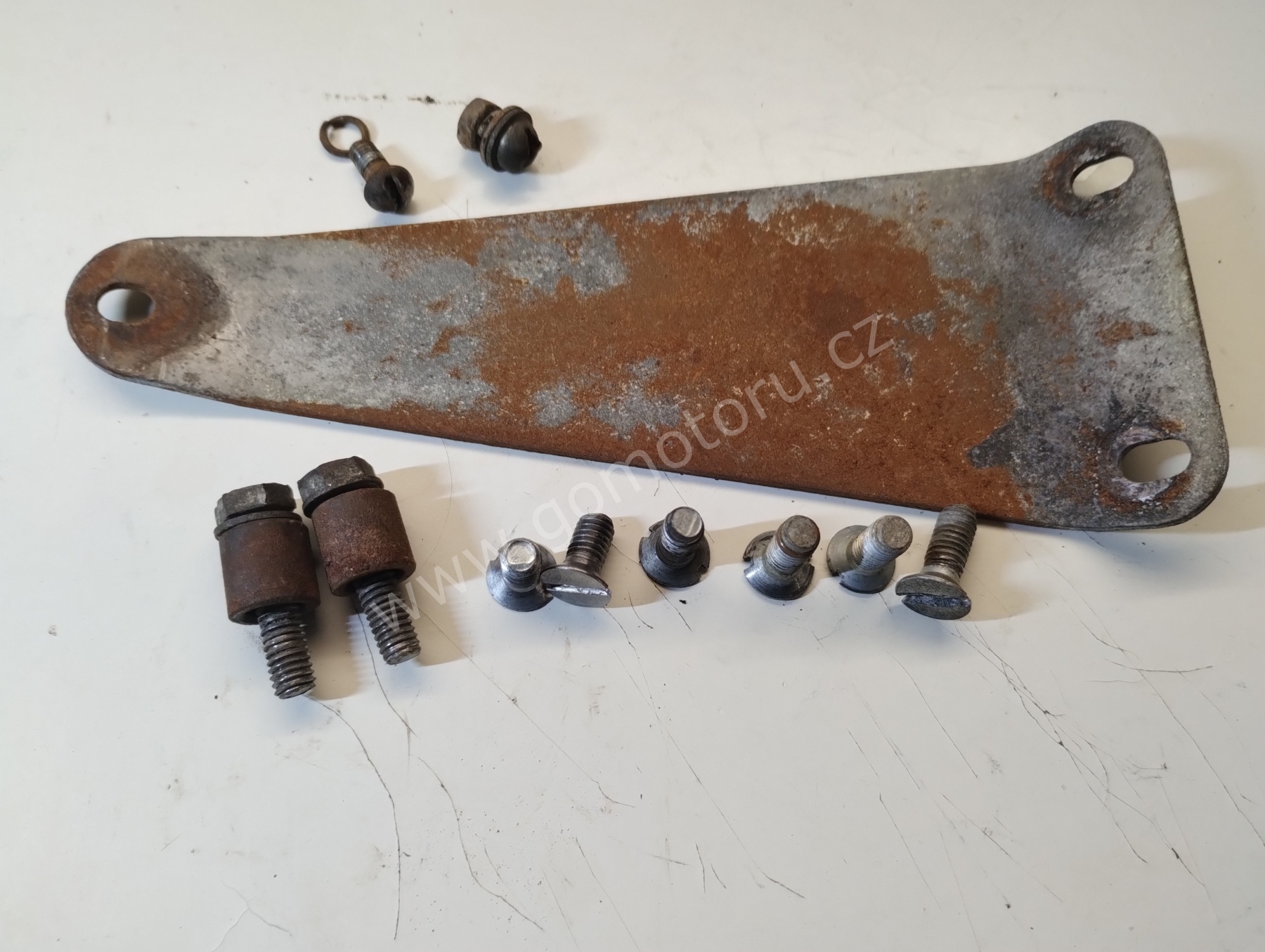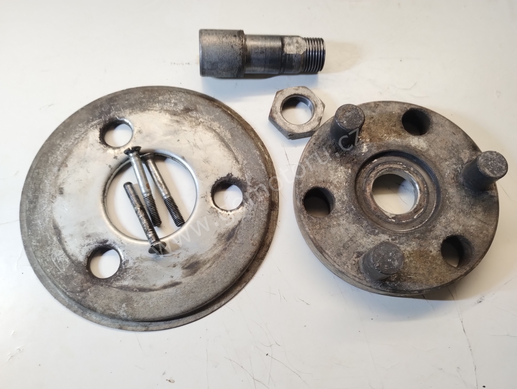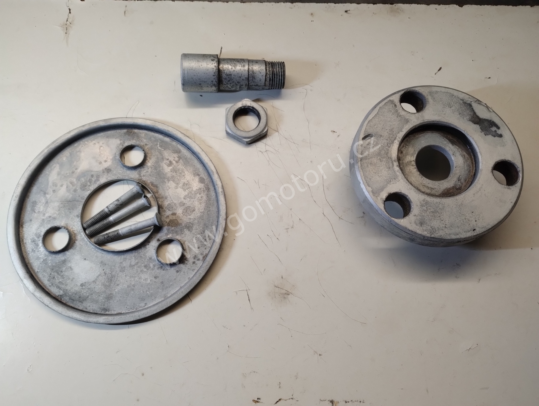 V první etapě pozinkuji díly pro uchycení zadního kola. Osa, matice, záchyt brzdy a šponováky. Nejdříve je potřeba všechny díly okartáčovat od špíny a rzi. První fotografie ukazuje původní stav. Druhá fotografie po očištění. Třetí fotografie je po zinkování a poslední foto z galerie jsou hotové díly po dočištění.