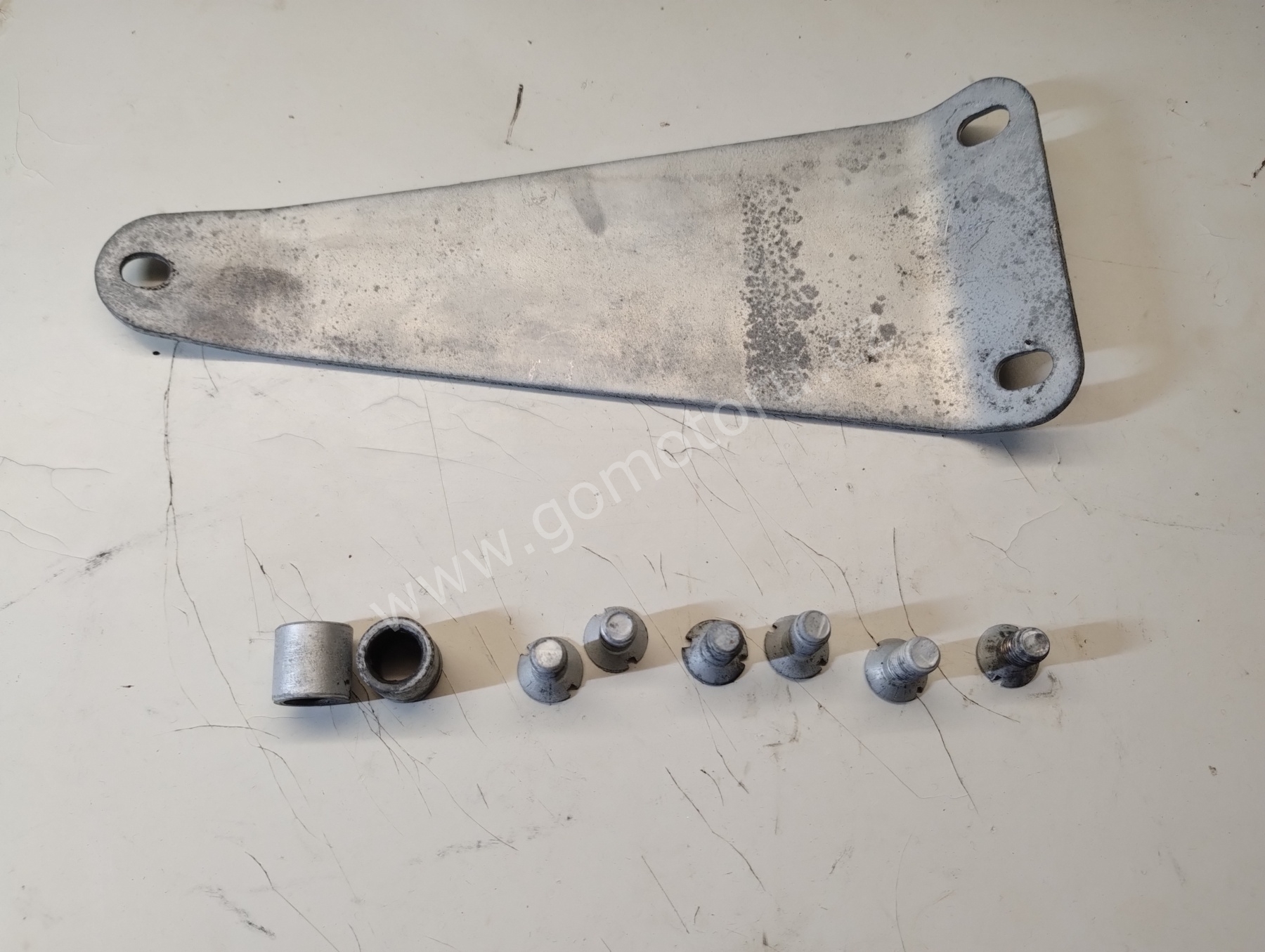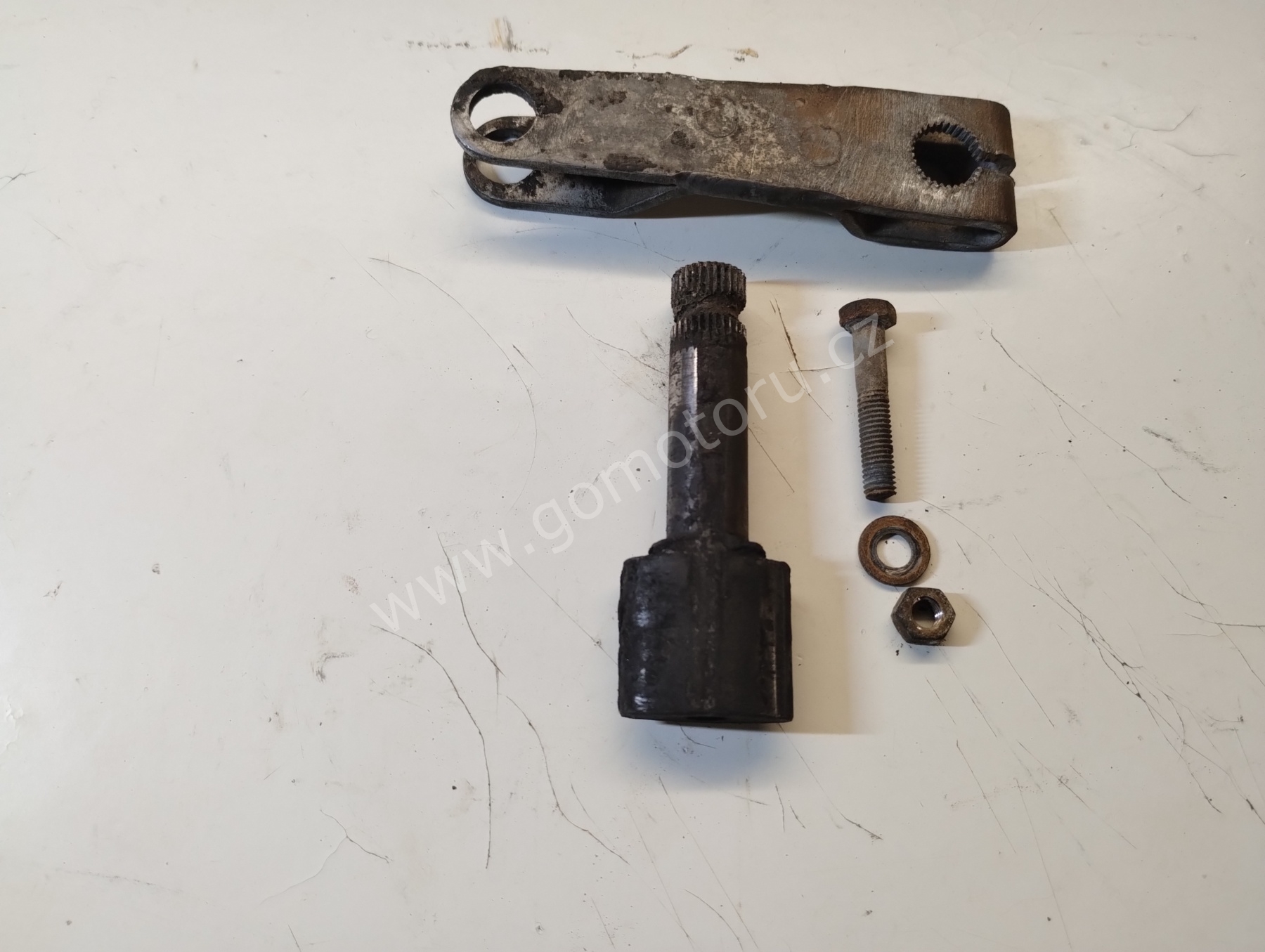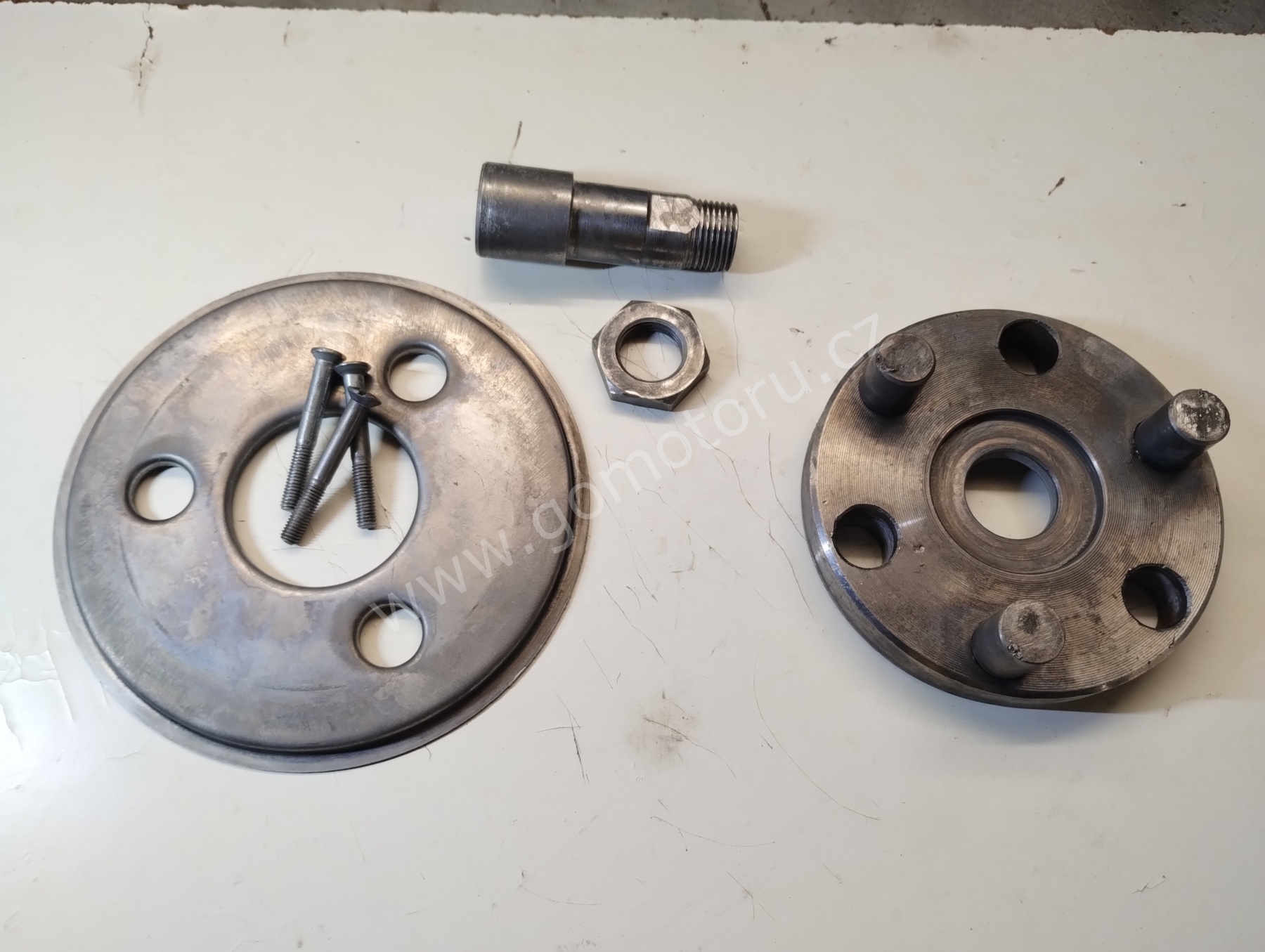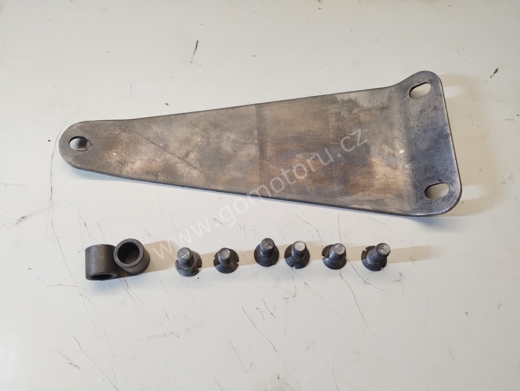 V první etapě pozinkuji díly pro uchycení zadního kola. Osa, matice, záchyt brzdy a šponováky. Nejdříve je potřeba všechny díly okartáčovat od špíny a rzi. První fotografie ukazuje původní stav. Druhá fotografie po očištění. Třetí fotografie je po zinkování a poslední foto z galerie jsou hotové díly po dočištění.